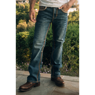 Men's Dark Slim Boot Cut Brown Triple Stitch Signature Pocket Denim Pants