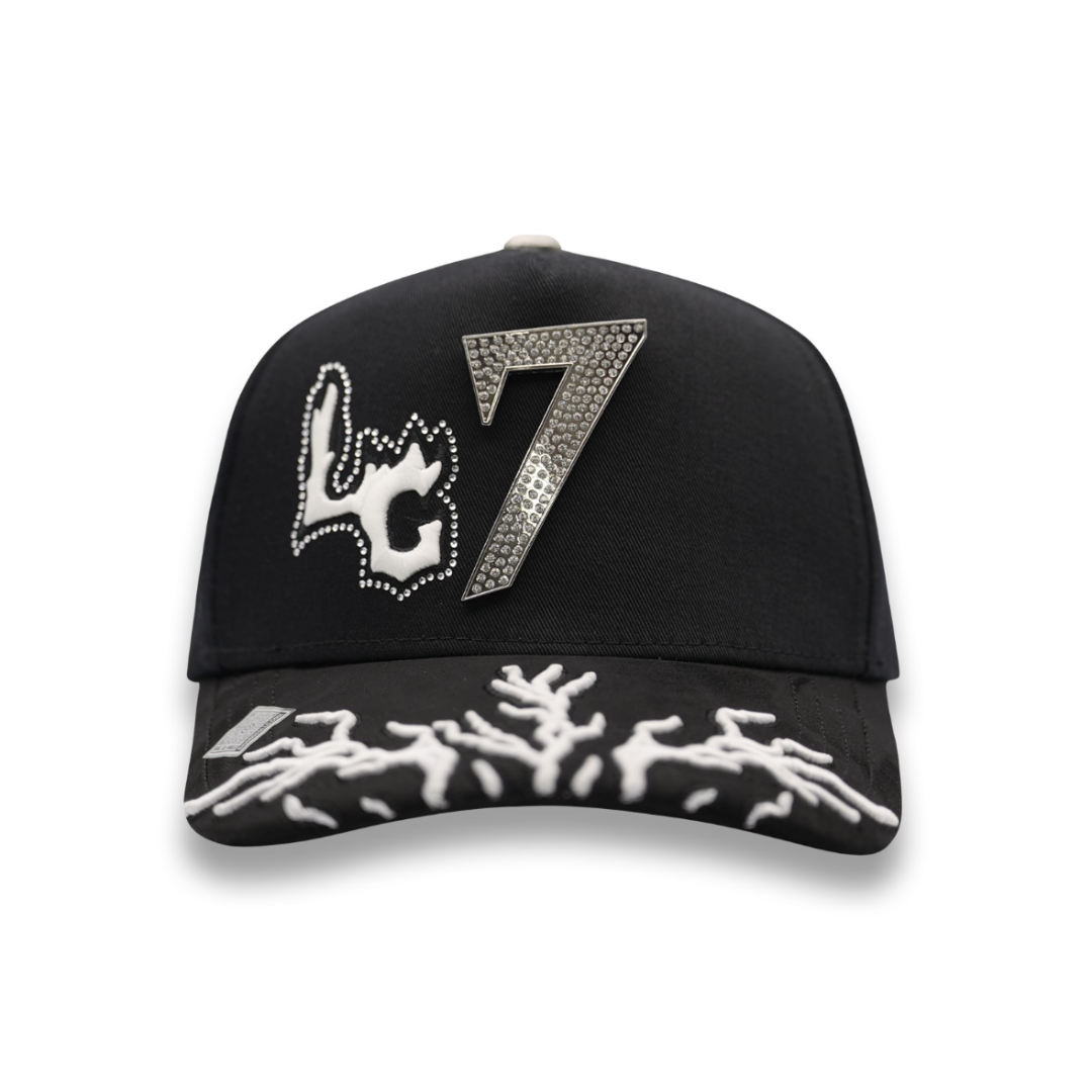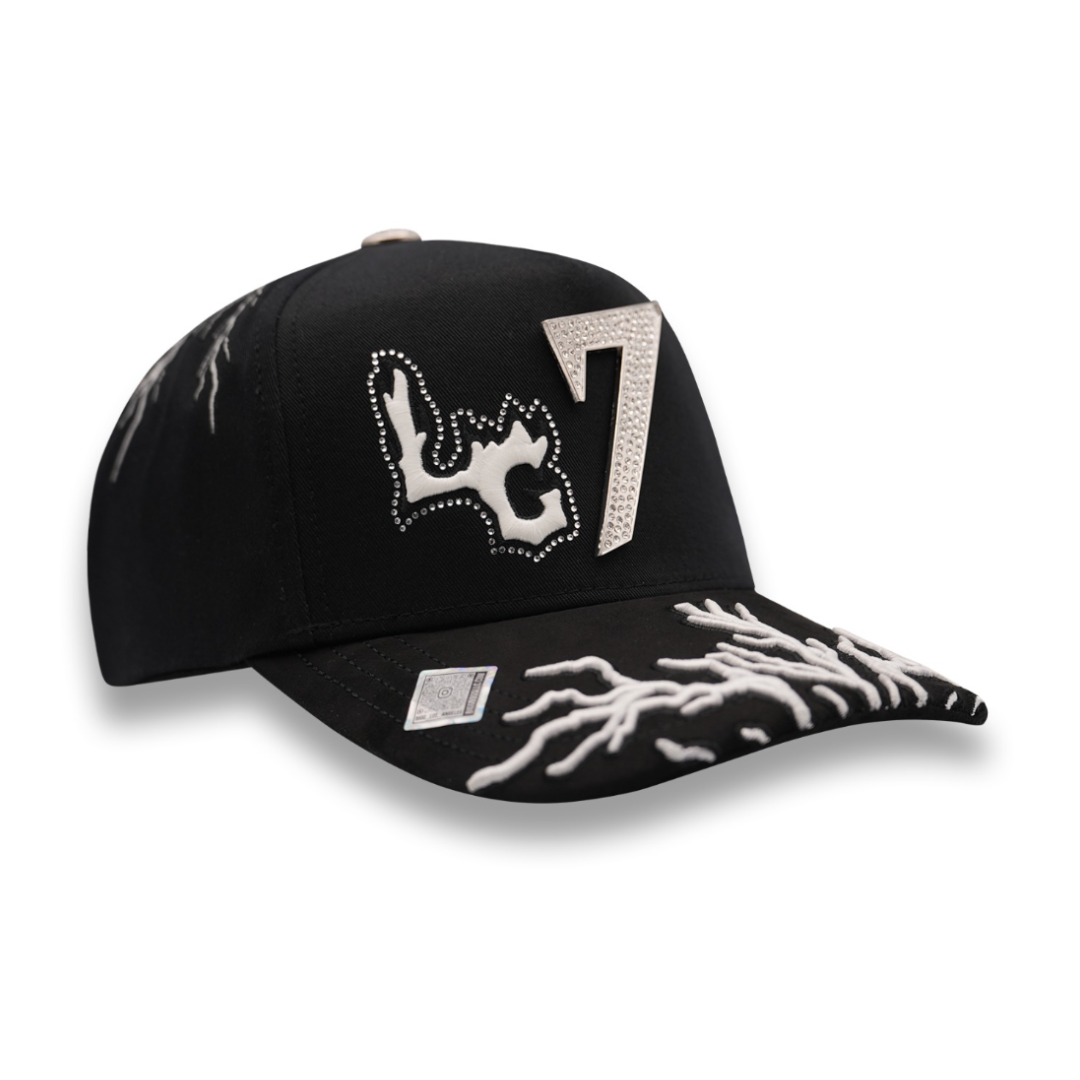 The sleek black base sets the stage for striking white lightning embroidery wrapping across the bill and crown, giving the hat an electrifying edge. The front features the standout LG7 emblem, accented with shimmering rhinestone-style detailing for a touch of flash and personality. Inside, premium branded taping proudly displays “BIGG BOSS” throughout, reinforcing its high-quality construction.