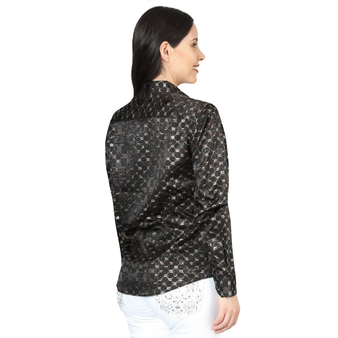 Make a bold entrance with this stunning El General women’s Western shirt featuring a glossy black body highlighted with luxurious gold metallic detailing. Its tie-front design adds a modern, flirty twist to classic Western styling, while the structured collar and long sleeves deliver a polished silhouette. Perfect for concerts, rodeos, fiestas, or a night out, this statement top pairs effortlessly with denim, high-rise pants, and your favorite boots for a true vaquera-chic look. Shine from day to night with this eye-catching Western essential from MexWest.