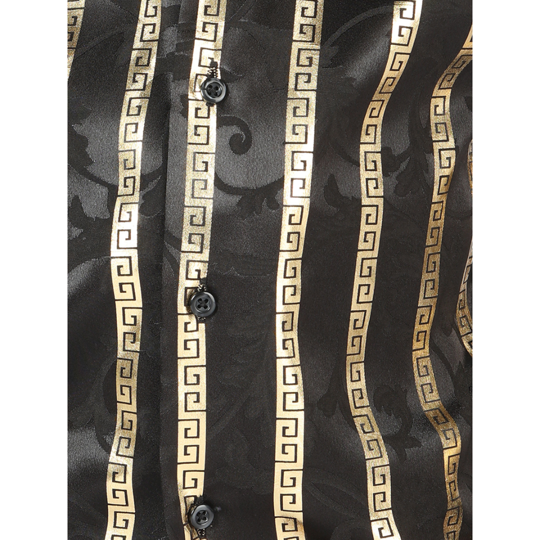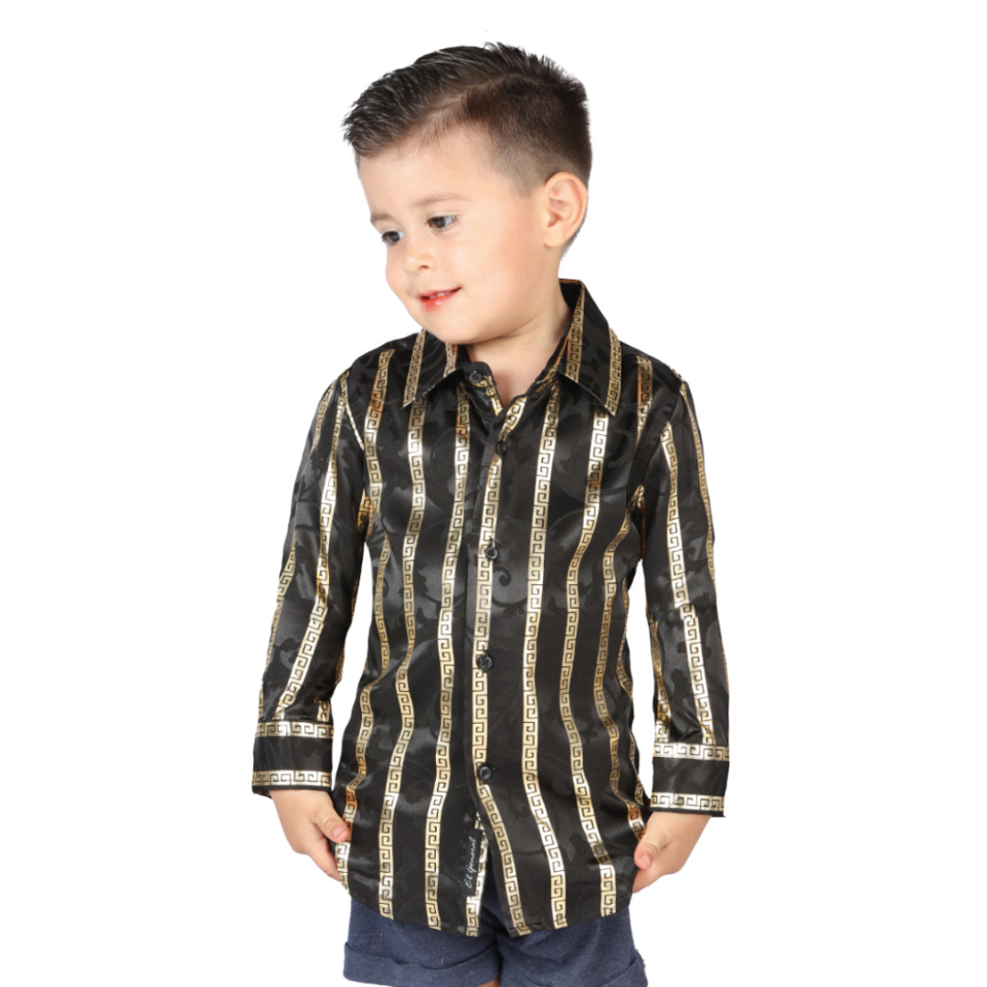 Dress your little one in bold Western style with this El General Boys’ Black & Gold Long Sleeve Shirt. Featuring a striking Greek key stripe pattern and a glossy satin-like finish, this shirt adds instant sophistication to any rodeo, family celebration, birthday party, or holiday event. Comfortable, lightweight, and eye-catching, it pairs perfectly with jeans, boots, or dress pants—making it a standout choice for special occasions or matching family outfits.