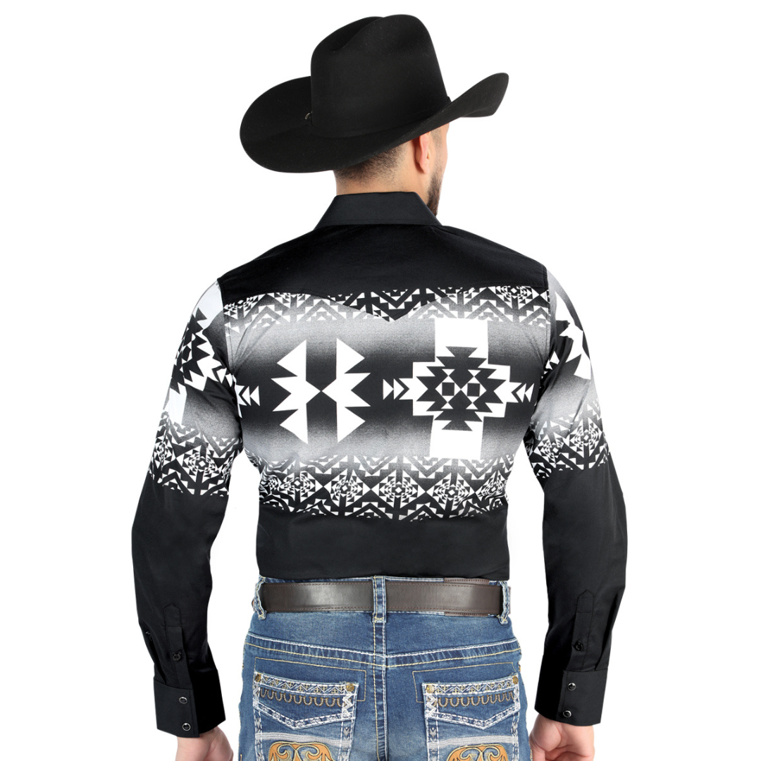 Stand out with this bold two-tone El General Western shirt featuring a striking black and white color combination accented with a classic Aztec print. Built for comfort, durability, and Western style, this button-down delivers a polished look whether you're headed to a rodeo, a night out, or everyday wear. Designed with dual front pockets, contrast stitching, and a tailored fit, it brings together modern cowboy fashion with traditional Southwestern patterns. Pair it with your favorite jeans and boots from MexWest for a complete Western look.