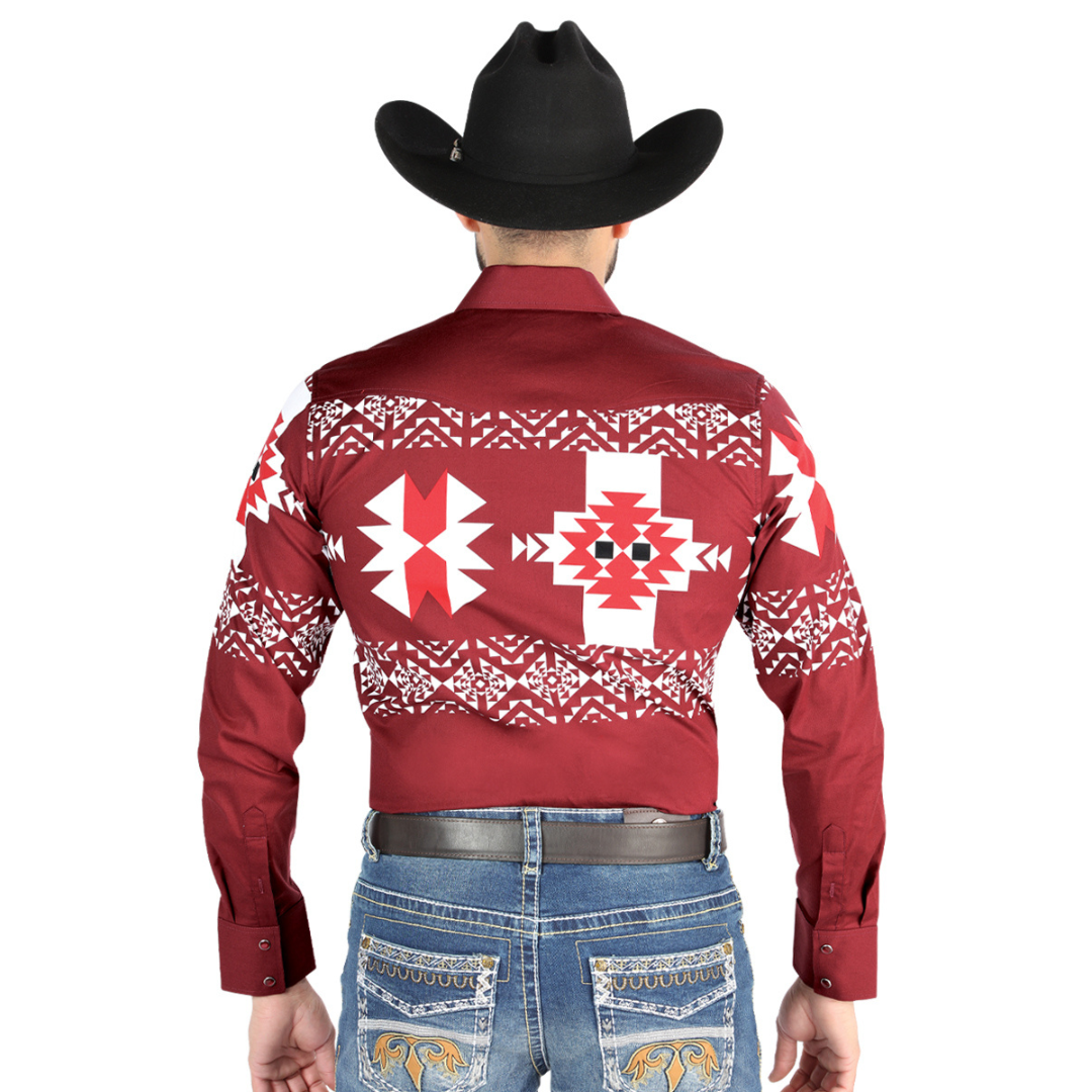 Stand out with this bold two-tone El General Western shirt featuring a striking burgundy and white color combination accented with a classic Aztec print. Built for comfort, durability, and Western style, this button-down delivers a polished look whether you're headed to a rodeo, a night out, or everyday wear. Designed with dual front pockets, contrast stitching, and a tailored fit, it brings together modern cowboy fashion with traditional Southwestern patterns. Pair it with your favorite jeans and boots from MexWest for a complete Western look.