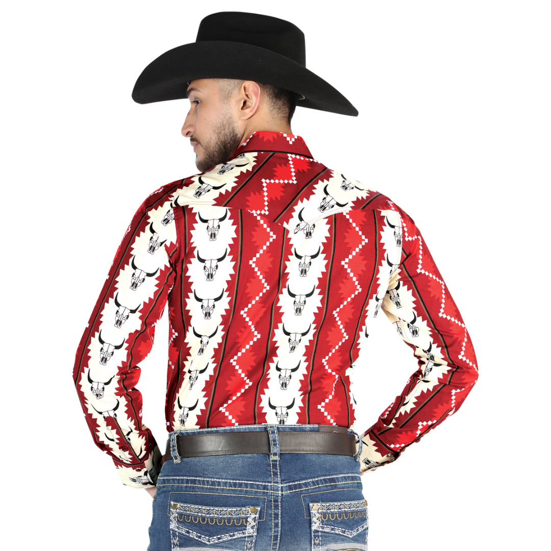 Turn heads with bold cowboy style in this El General Men’s Long Sleeve Western Shirt featuring a striking bull skull pattern in shades of Red, black, and off white. This shirt blends rugged Western character with a modern, tailored fit that’s comfortable enough for all-day wear. Whether you’re headed to a rodeo, a night out, a fiesta, or simply want to elevate your daily Western look, this eye-catching design pairs perfectly with jeans, boots, and your favorite hat. A MexWest staple for the modern vaquero.
