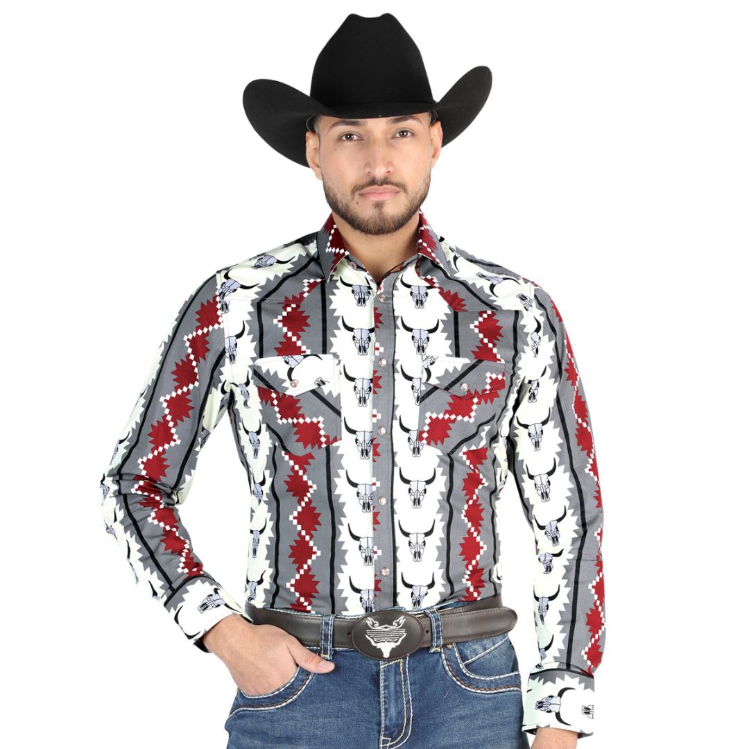 Turn heads with bold cowboy style in this El General Men’s Long Sleeve Western Shirt featuring a striking bull skull pattern in shades of gray, red, and white. This shirt blends rugged Western character with a modern, tailored fit that’s comfortable enough for all-day wear. Whether you’re headed to a rodeo, a night out, a fiesta, or simply want to elevate your daily Western look, this eye-catching design pairs perfectly with jeans, boots, and your favorite hat. A MexWest staple for the modern vaquero.