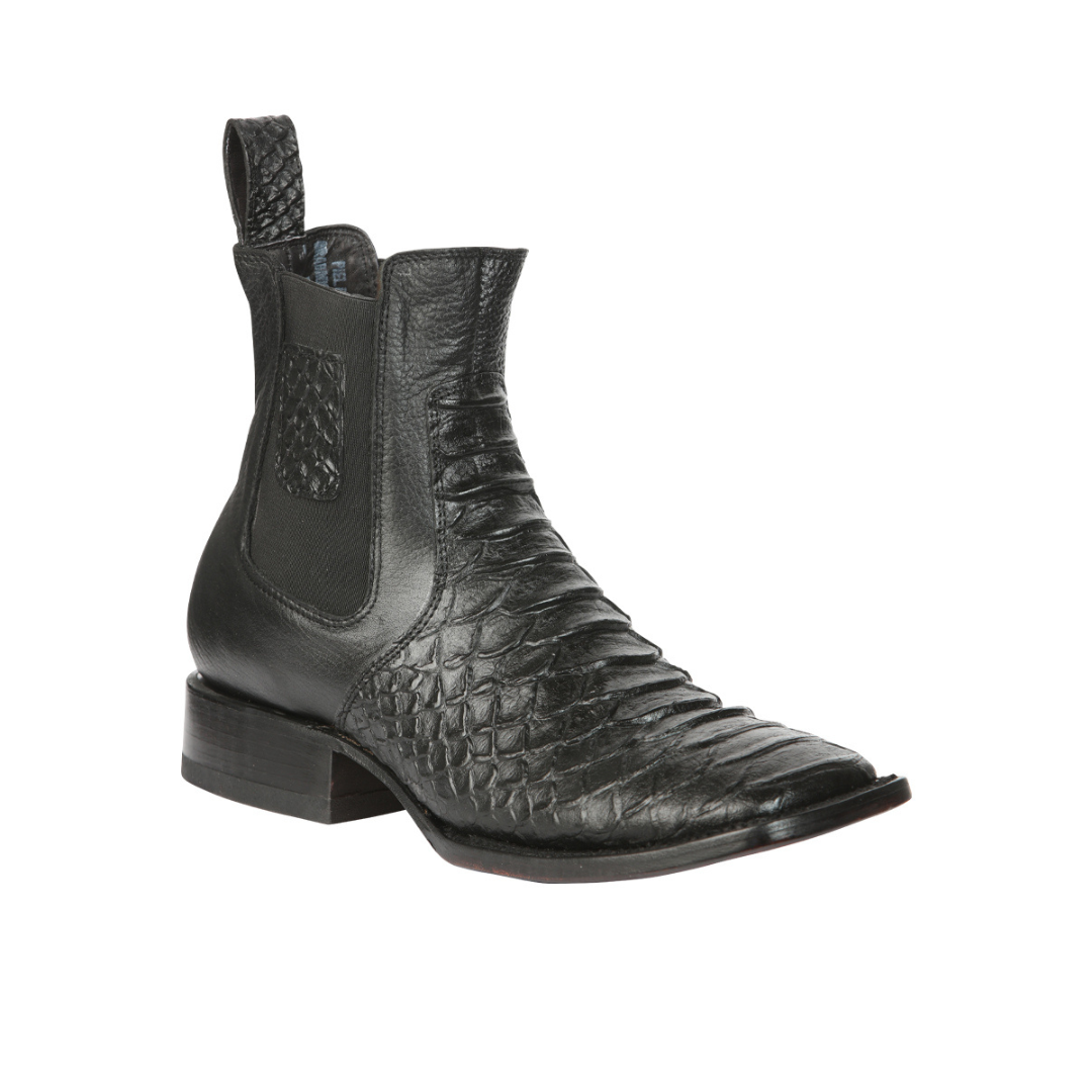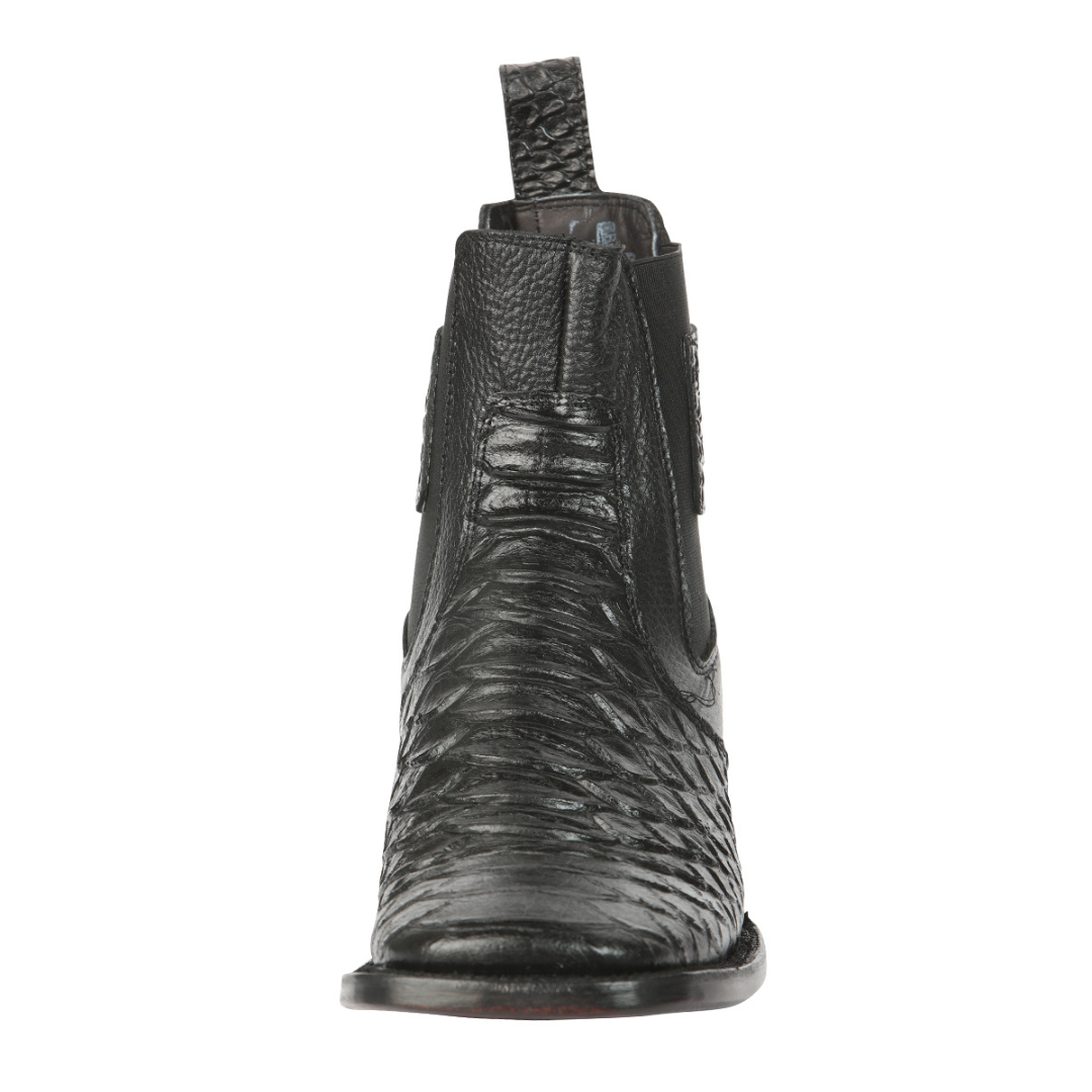 The El General Men’s Python Imitation Black Ankle Boots offer a bold, stylish twist on classic Western footwear. These boots feature a sleek, black imitation python skin texture, giving them an exotic and eye-catching look while maintaining a high level of durability and comfort. They are designed for men who want to add a bit of edge to their wardrobe with a sophisticated touch. - Toe Shape (Horma): Texas Rodeo - Sole (Suela): Genuine Leather (Cuero) - Made in Mexico.