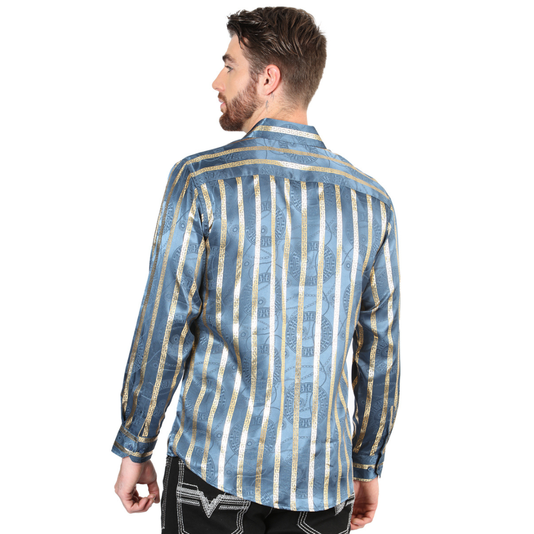 Elevate your Western style with this sleek and eye-catching El General men’s metallic button-down shirt. Featuring a polished Teal base with gold vertical stripe detailing, this shirt delivers a bold yet sophisticated look for rodeos, concerts, night events, and special occasions. The glossy finish adds a high-end shine while the classic Western collar and tailored fit provide comfort and structure. Pair it with your favorite boots and denim from MexWest for a refined vaquero style that stands out in any crowd.