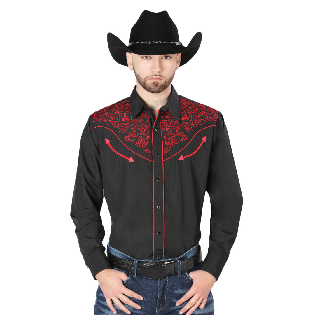 Make a bold Western statement with this El General men’s long sleeve Western shirt, crafted in a clean black tone with rich red embroidered detailing. Featuring a classic Western yoke with ornate scroll embroidery across the chest and shoulders, this shirt delivers authentic cowboy style with a refined finish. Arrow-style embroidery accents and contrast piping enhance its traditional Western appeal, while the snap-button front keeps it functional and timeless.