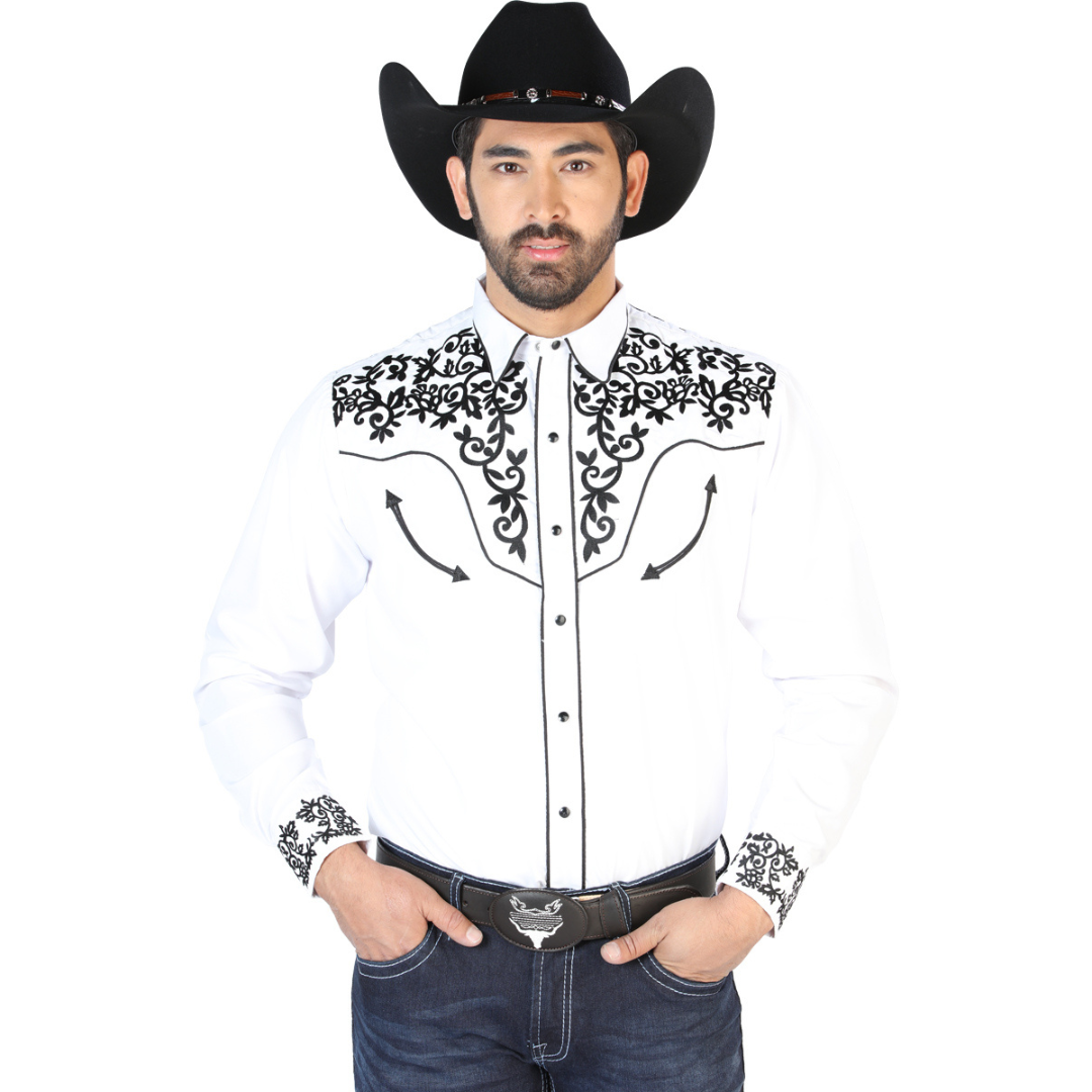 Make a bold Western statement with this El General men’s long sleeve Western shirt, crafted in a clean white tone with rich black embroidered detailing. Featuring a classic Western yoke with ornate scroll embroidery across the chest and shoulders, this shirt delivers authentic cowboy style with a refined finish. Arrow-style embroidery accents and contrast piping enhance its traditional Western appeal, while the snap-button front keeps it functional and timeless.