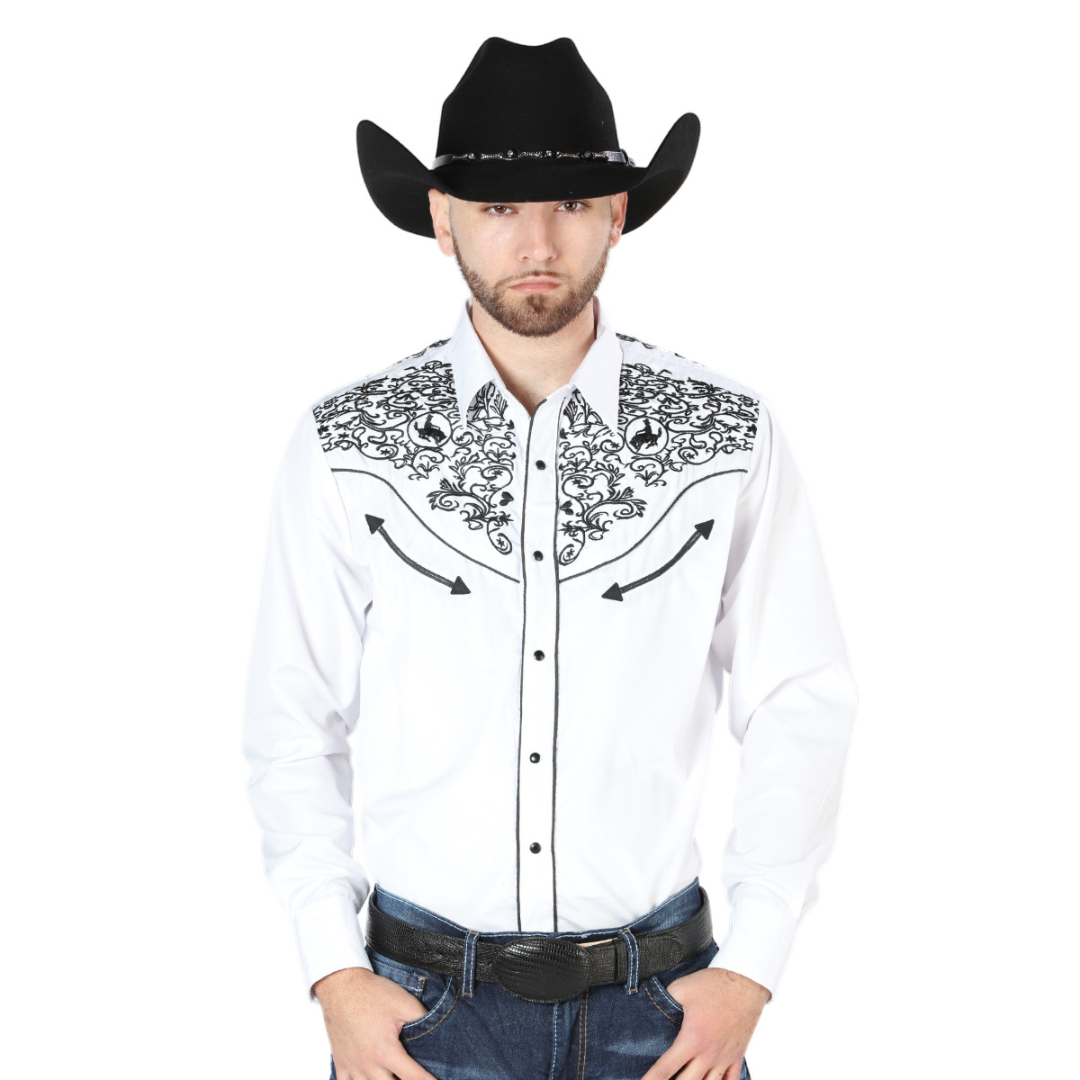 Make a bold Western statement with this El General men’s long sleeve Western shirt, crafted in a clean white tone with rich black embroidered detailing. Featuring a classic Western yoke with ornate scroll embroidery across the chest and shoulders, this shirt delivers authentic cowboy style with a refined finish. Arrow-style embroidery accents and contrast piping enhance its traditional Western appeal, while the snap-button front keeps it functional and timeless.