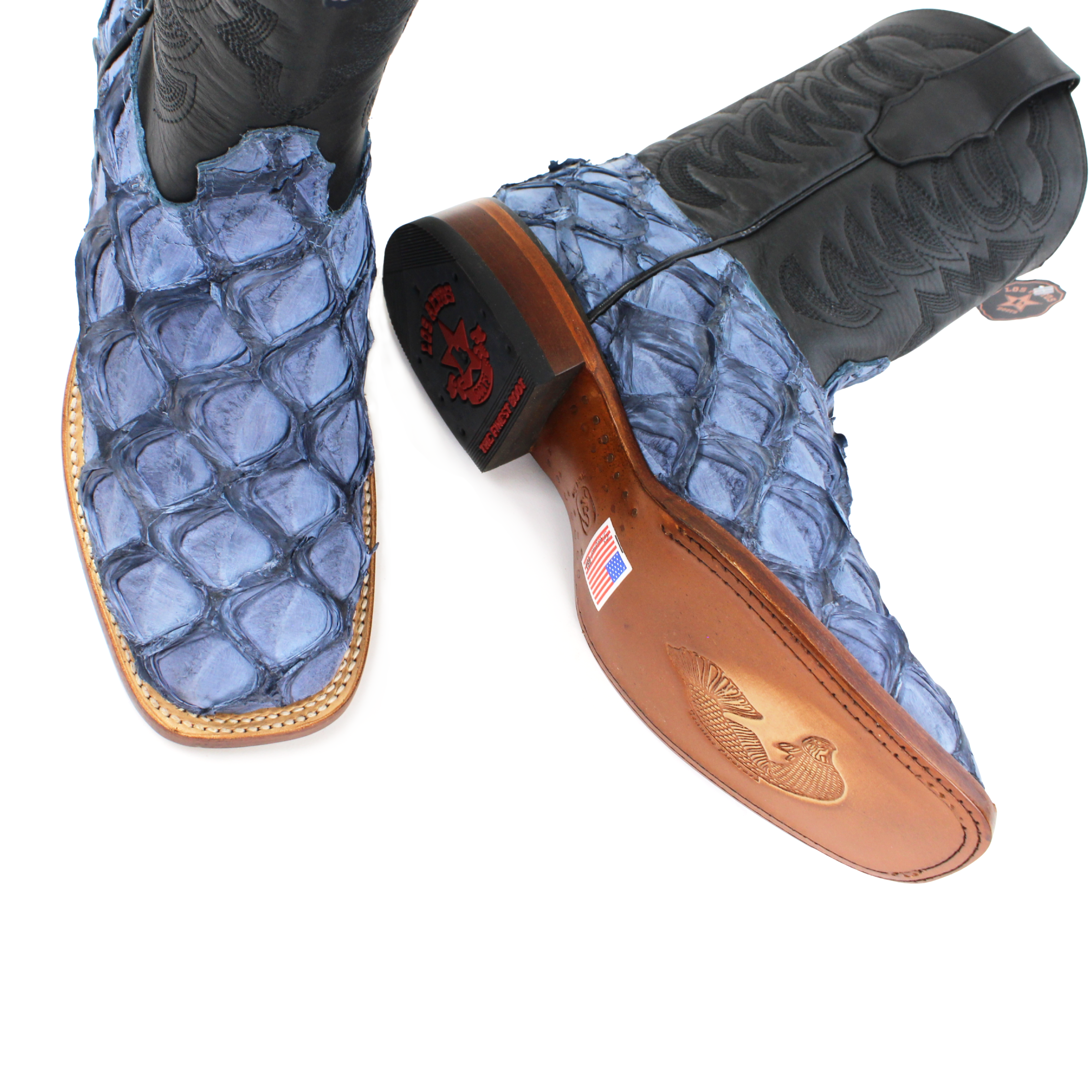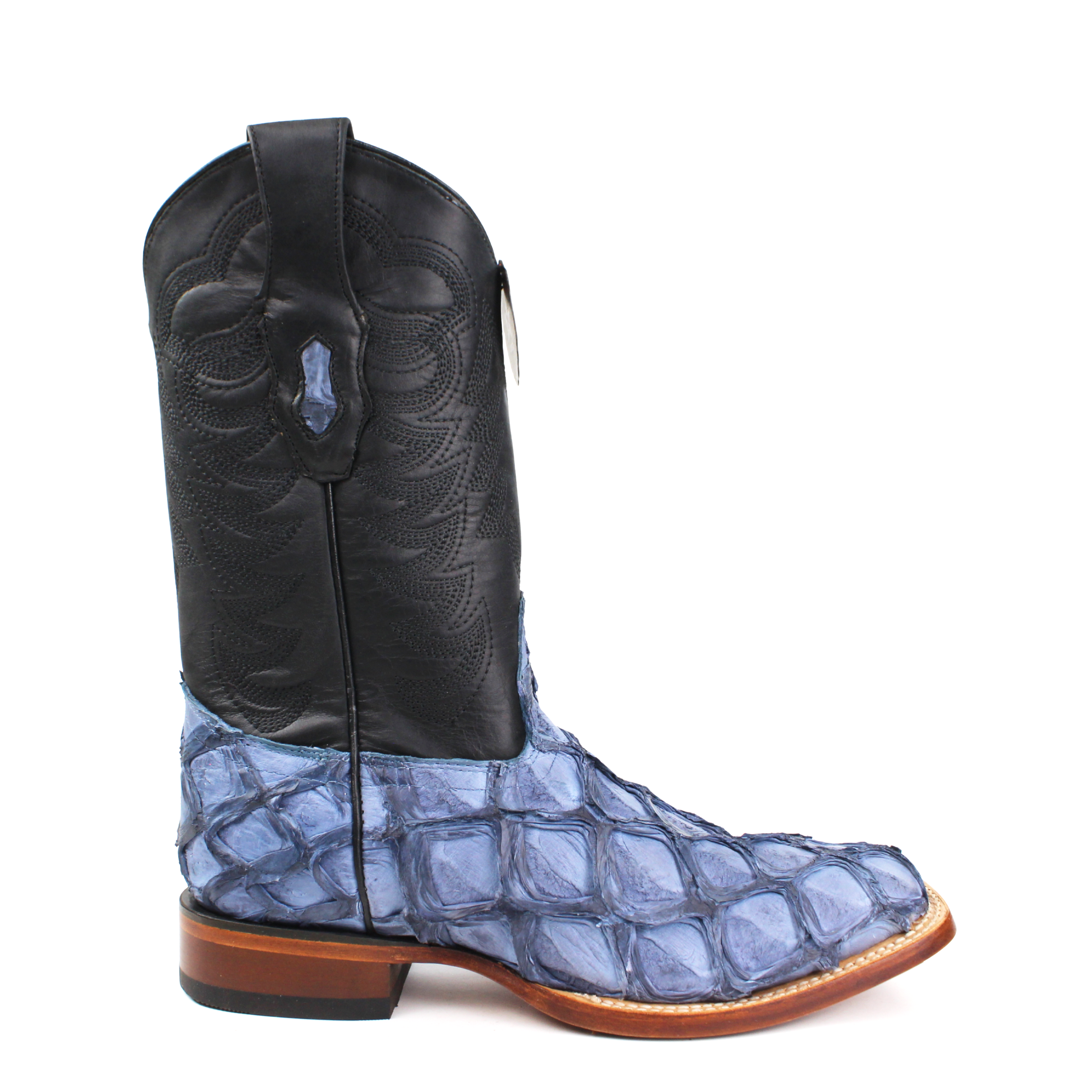 Make a powerful statement with the bold texture and exotic craftsmanship of the Los Altos Men’s Denim Blue Pirarucu Square Toe Boots. Handcrafted from genuine pirarucu fish leather, these boots feature a dramatic, oversized scale pattern that delivers a rugged yet refined look unlike any other exotic hide.