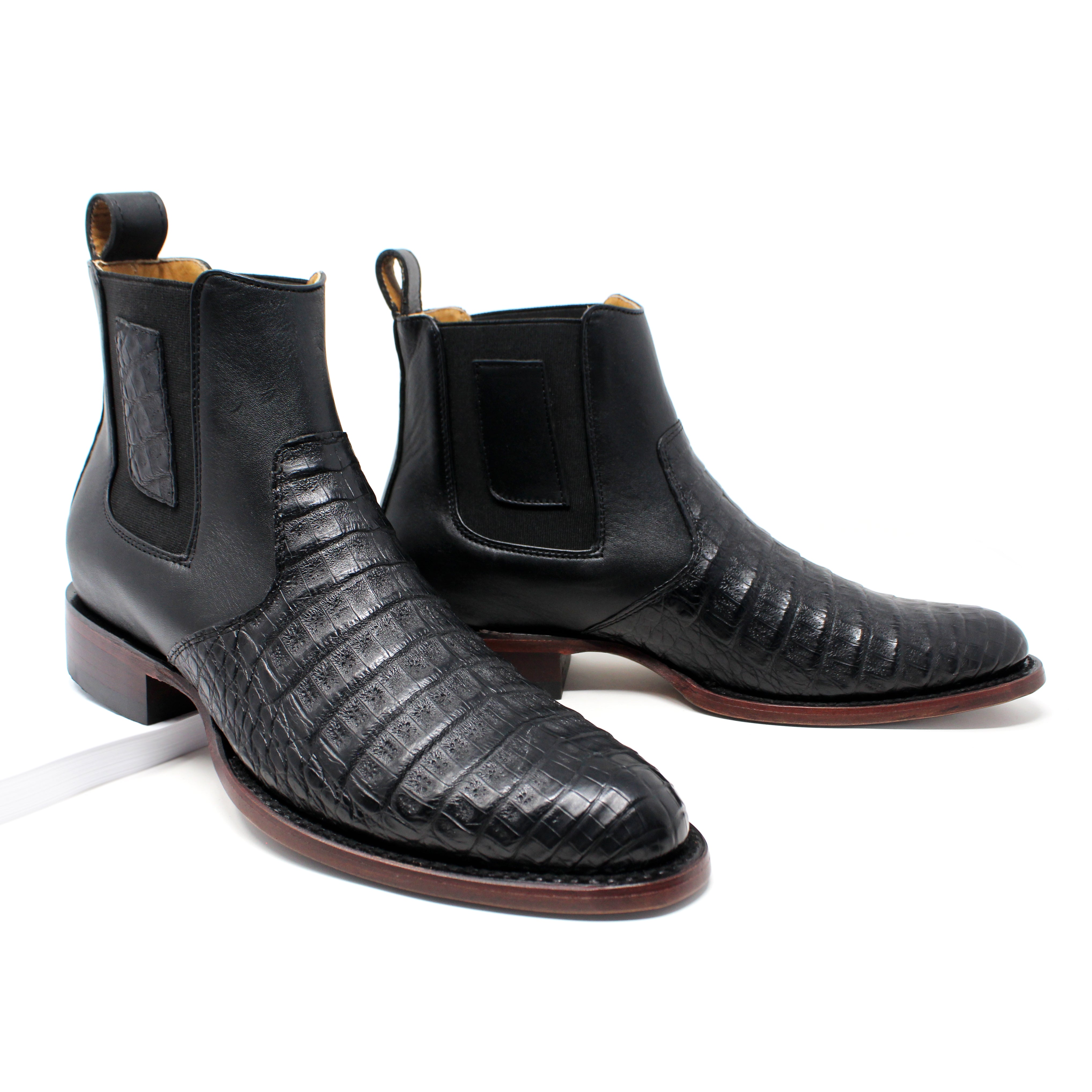 Step into premium Western style with the Los Altos Genuine Caiman Belly Botín in Black. Handcrafted in Mexico, this short-ankle boot blends exotic luxury with everyday comfort. Made from authentic caiman belly leather, it delivers a bold, high-end look paired with durable construction, a cushioned interior, and elastic side panels for an easy slip-on fit. Perfect for rodeos, events, nights out, or elevating your everyday Western wardrobe, this Los Altos botín is a standout piece built to last.