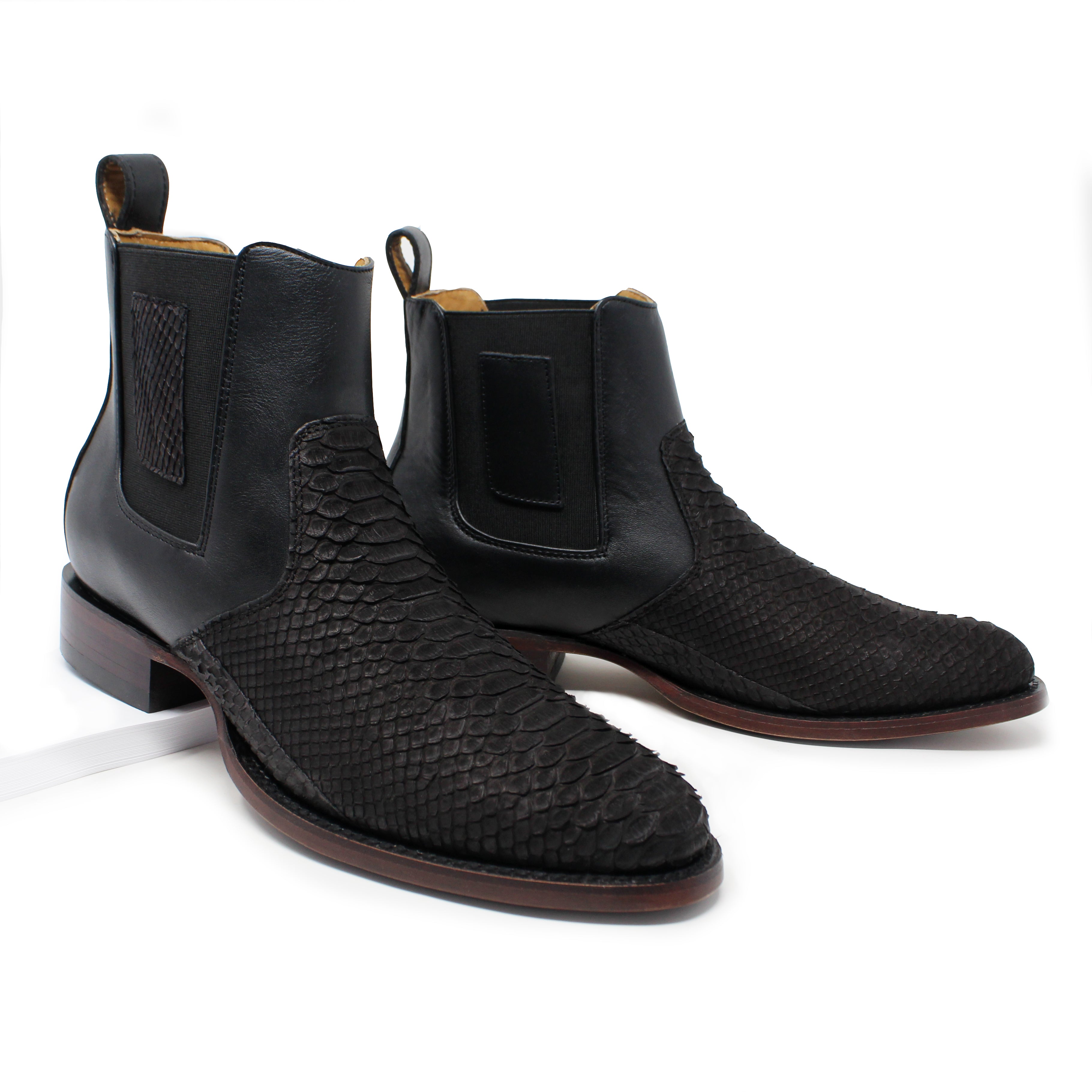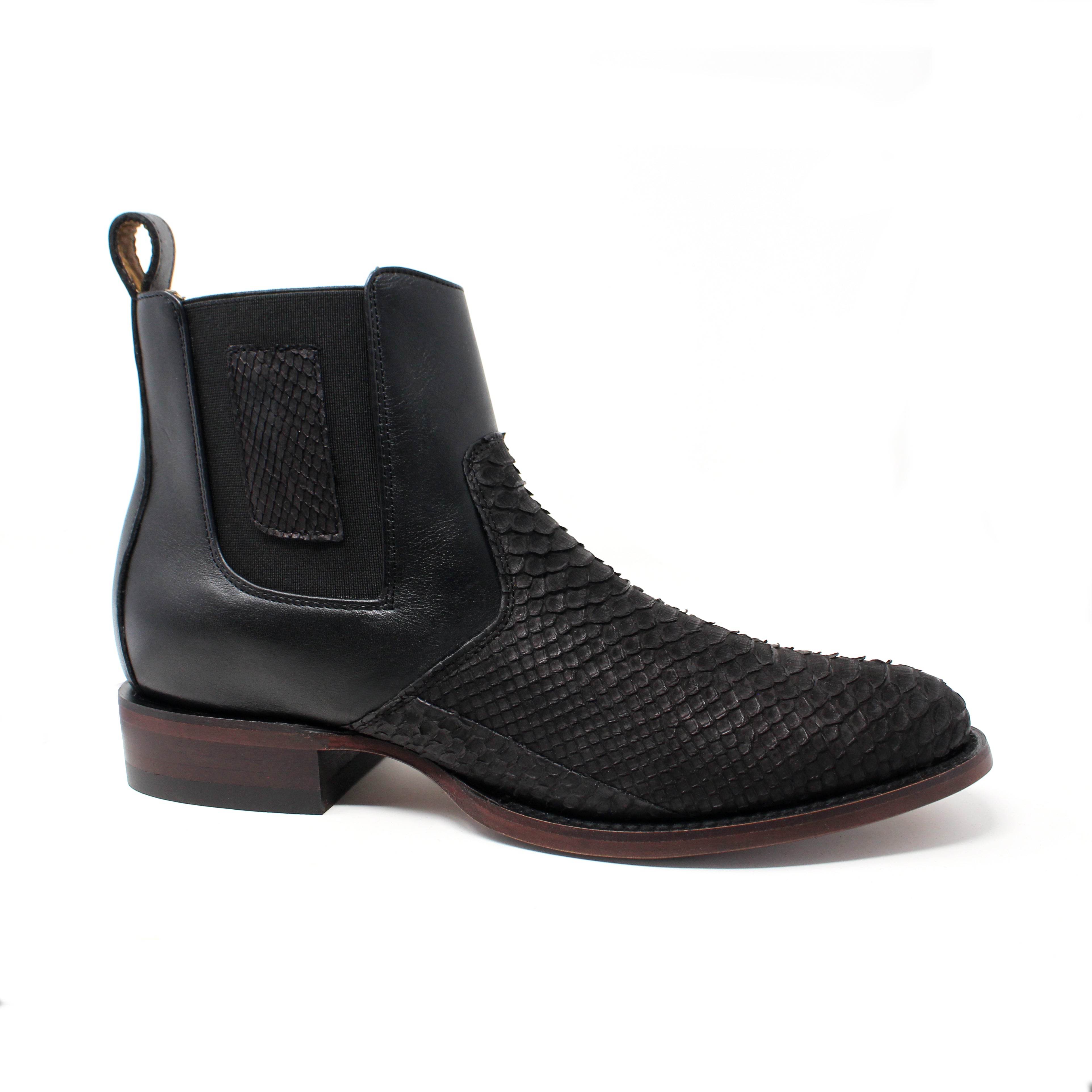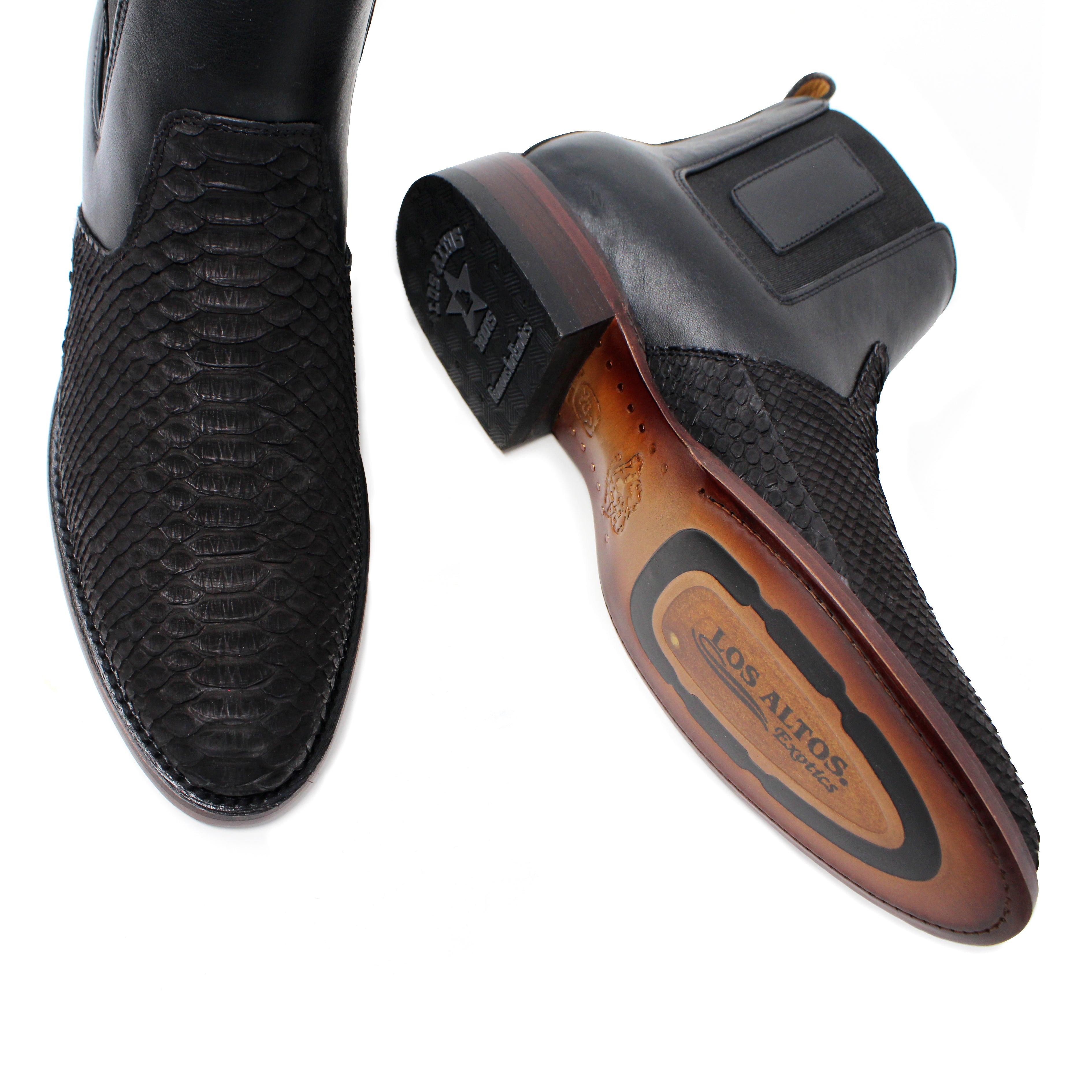 Elevate your Western style with the Los Altos Genuine Python Leather Botín in sleek Nubuck black. Handcrafted with premium exotic python leather, this ankle-height boot delivers bold texture, unmatched craftsmanship, and everyday comfort. Featuring elastic side panels for a secure slip-on fit, a soft leather interior, and a durable leather outsole, this exotic botín is perfect for rodeos, concerts, nights out, or adding a luxury edge to your daily Western wardrobe. A true statement piece from Los Altos Boots.