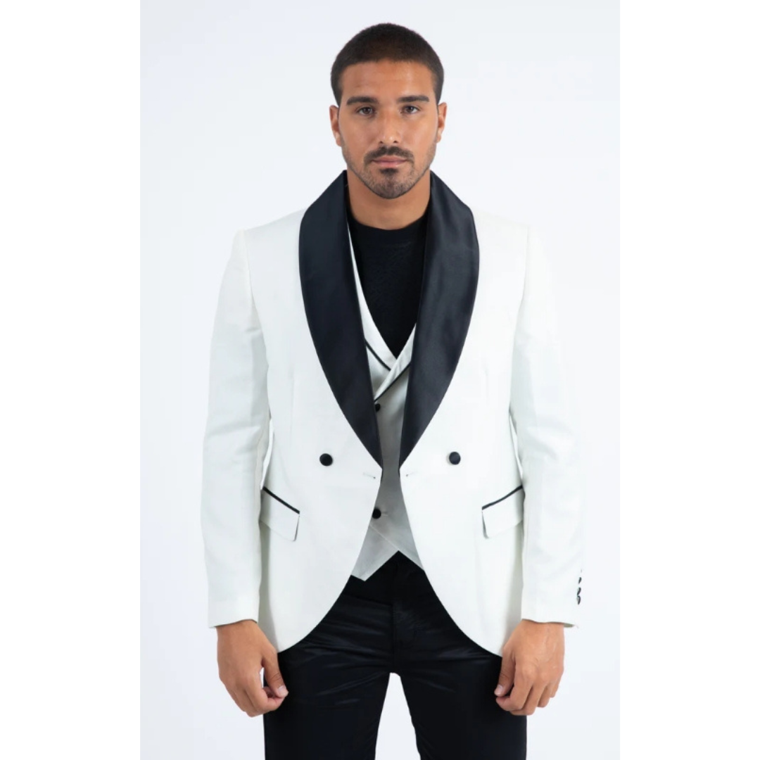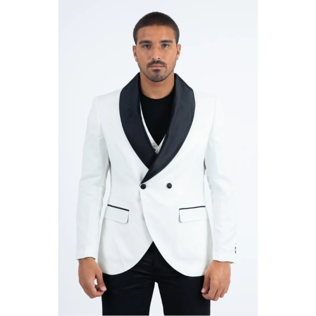 Description: Elevate your formal Western style with this premium Platini men's tuxedo jacket and matching double-breasted vest. Crafted in an elegant white jacquard finish, this set features a sleek black satin shawl lapel and contrast piped detailing for a refined, modern look.