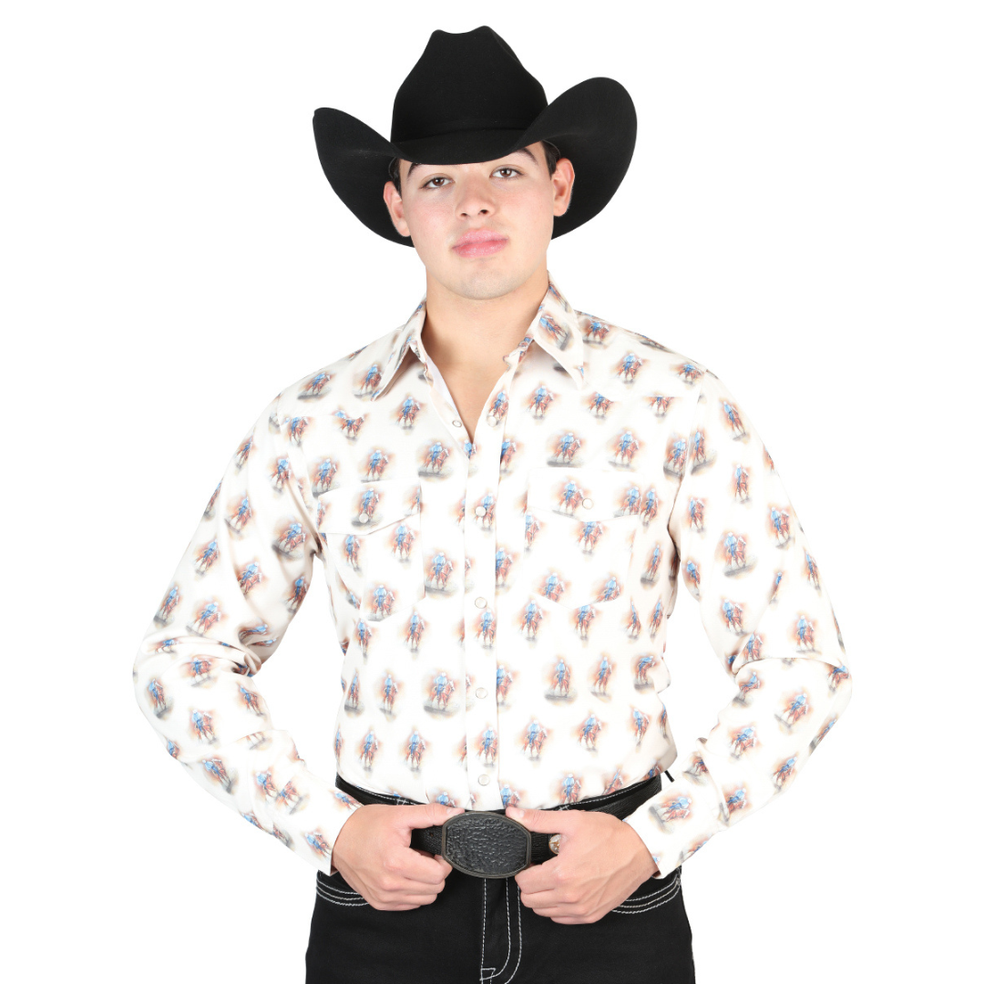 Elevate your Western wardrobe with this El General Cream Bronc Rider Print Long Sleeve Shirt—a bold yet classic choice for any cowboy. Featuring a soft White background with a repeating bronc-riding cowboy graphic, this shirt delivers authentic rodeo style while remaining clean and wearable for everyday looks. Perfect for dances, rodeos, concerts, work, or casual outings, it pairs effortlessly with denim, boots, and your favorite hat. Comfort, durability, and Western heritage all come together in this standout El General design.