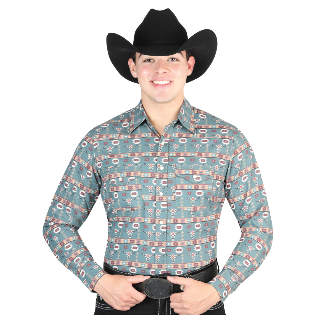 Add bold Western attitude to your wardrobe with this El General Green Bull Skull Print Long Sleeve Shirt. Designed with an all-over bull skull pattern, this shirt blends rustic cowboy style with a clean, modern look. Perfect for rodeos, concerts, nights out, or everyday Western fashion, it offers comfort, durability, and a sharp silhouette. Pair it with your favorite boots, denim, and hat for a true MexWest cowboy fit that stands out.