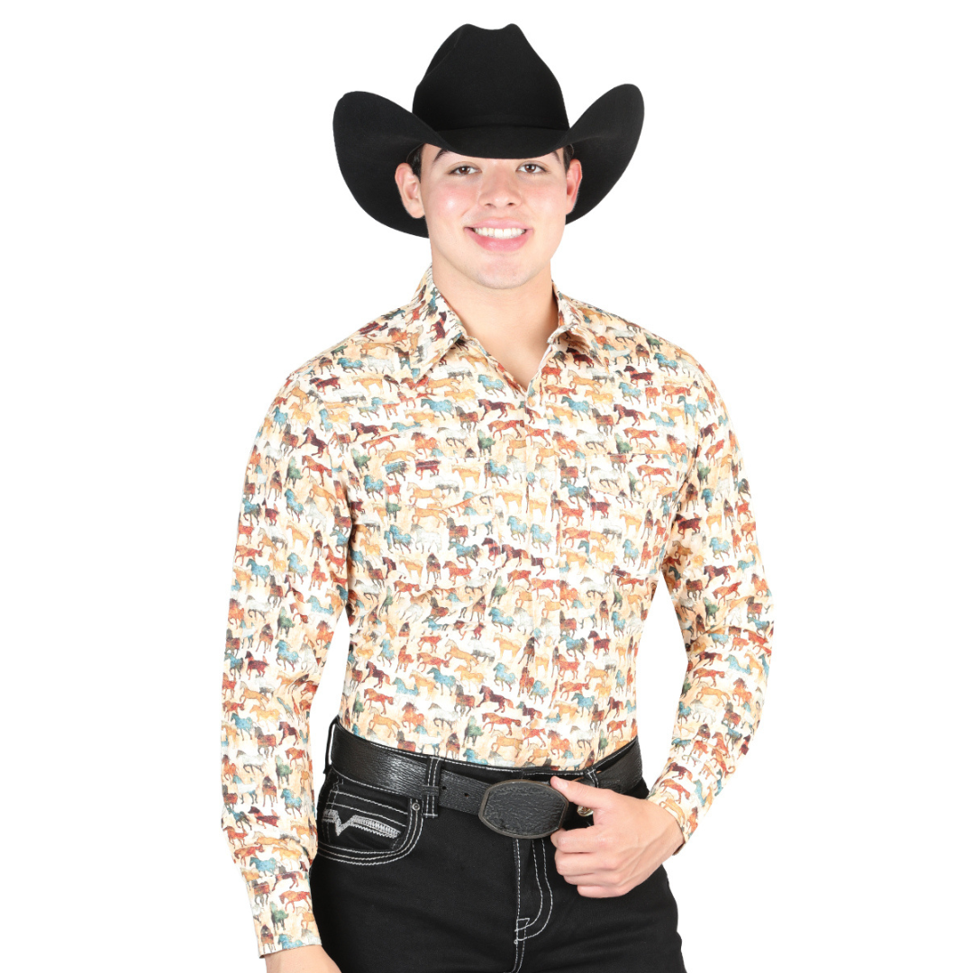 Add bold Western attitude to your wardrobe with this El General Khaki multicolor Horse Print Long Sleeve Shirt. Designed with an all-over multicolor cowboy pattern, this shirt blends rustic cowboy style with a clean, modern look. Perfect for rodeos, concerts, nights out, or everyday Western fashion, it offers comfort, durability, and a sharp silhouette. Pair it with your favorite boots, denim, and hat for a true MexWest cowboy fit that stands out.