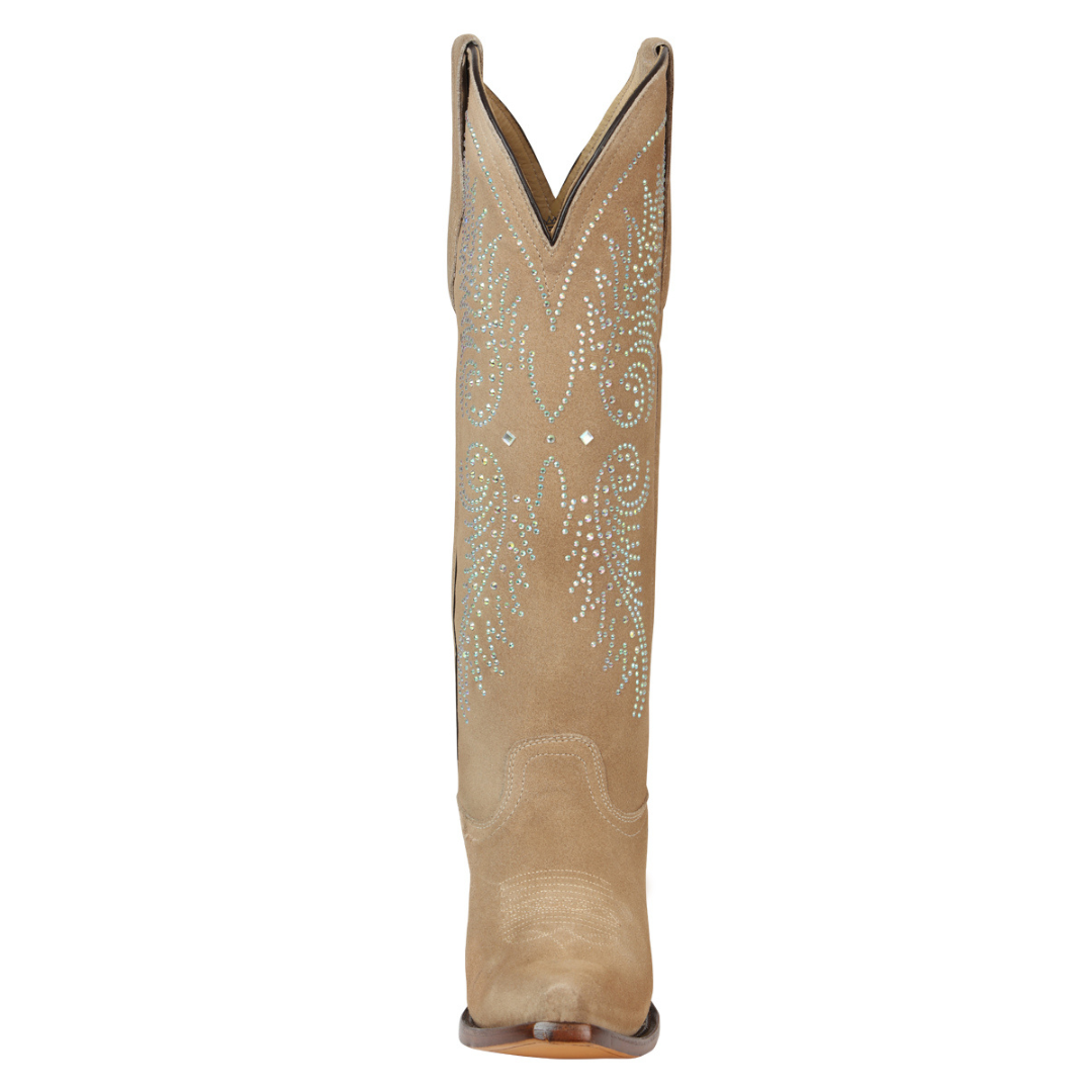 Add shimmer and Western elegance to your wardrobe with these El General Women’s Suede Rhinestone Cowboy Boots in a soft sand color. Crafted from genuine suede leather, these boots feature intricate rhinestone inlay patterns that sparkle with every step. The tall shaft creates a sleek, elongated look, while the snip toe and classic cowboy heel deliver authentic Western style. Perfect for concerts, festivals, nights out, or elevating your everyday cowgirl outfits — these boots blend comfort, glamour, and handcrafted quality.