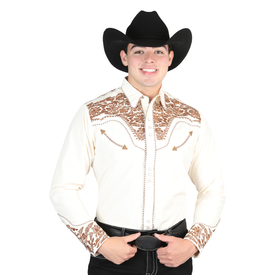 Make a bold entrance with this El General Men’s Beige & Dark Caramel Embroidered Charro Western Shirt. Featuring detailed floral embroidery across the chest, cuffs, and yoke, this statement piece blends traditional charro influence with modern Western style. The snap-front closure, crisp white base, and contrasting black design give it a sharp, elevated look—perfect for rodeos, quinceañeras, weddings, performances, and formal cowboy events. Pair it with boots, a hat, and a belt for a complete vaquero ensemble.