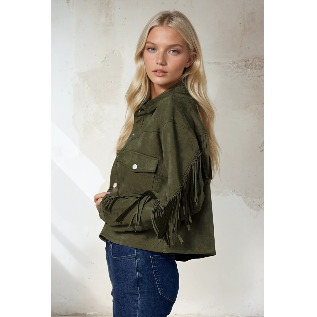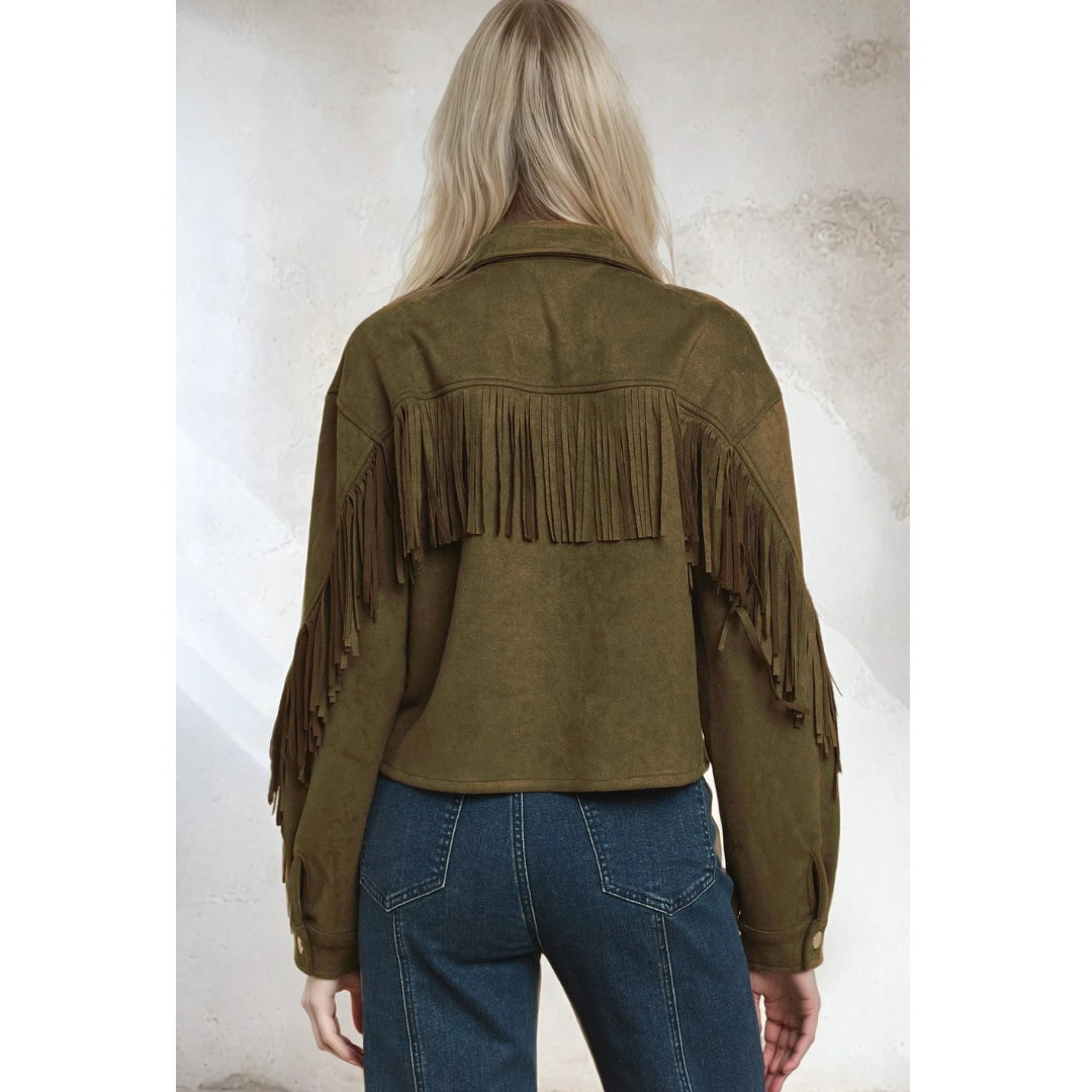 Add a touch of western flair to your look with this Olive Suede Fringe Western Jacket. Crafted from soft faux suede, this cropped button-up shacket blends rugged charm with chic modern style. The statement fringe detailing along the sleeves and back brings effortless movement, while the structured fit and front snap buttons make it both functional and fashionable. Perfect for layering over your favorite denim or a basic tank, this piece transitions seamlessly from day to night.