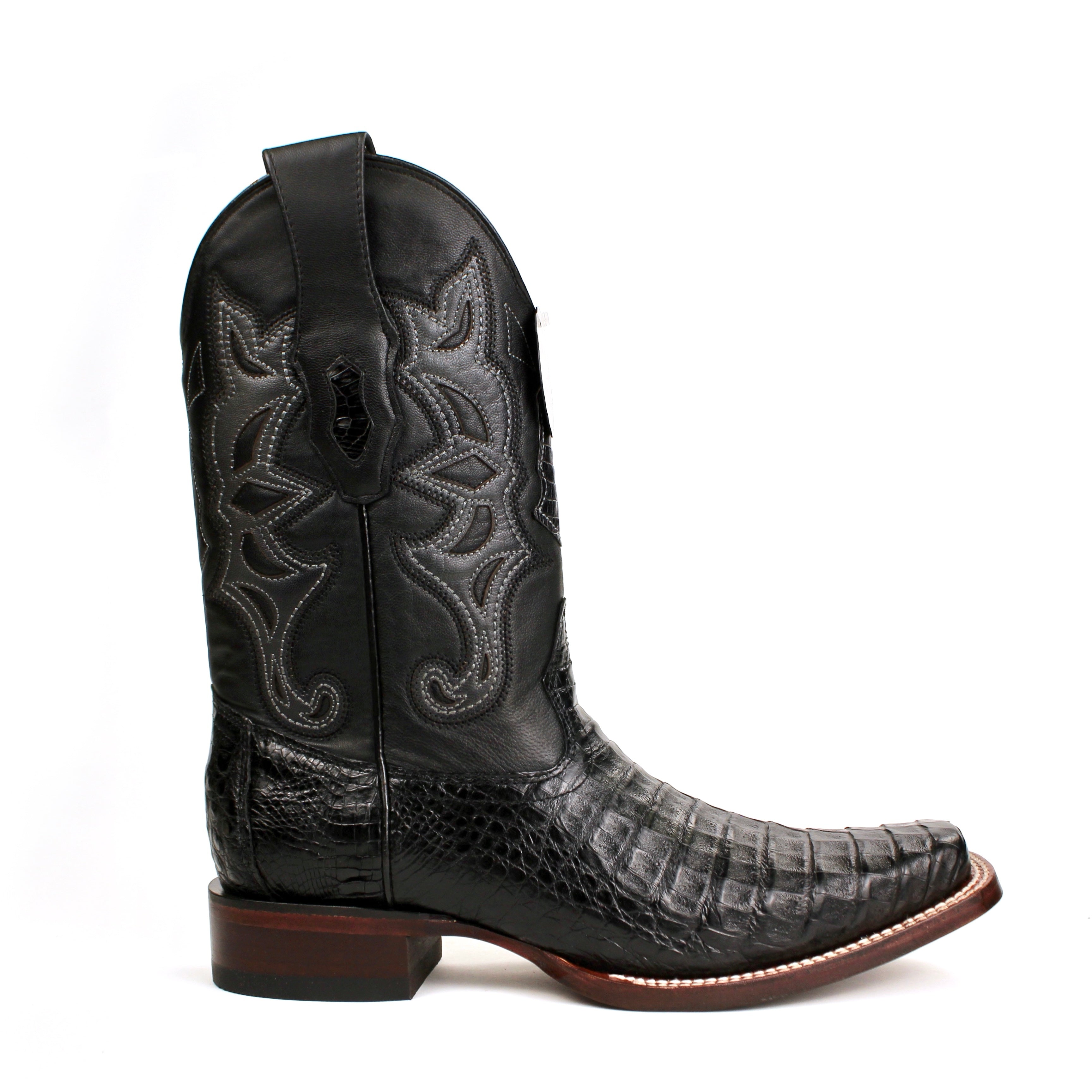 Command attention with these Men's Black Exotic Caiman Belly and Leather Cowboy Boots, crafted for those who appreciate timeless western elegance and premium craftmanship. Made from genuine caiman belly leather with a smooth cowhide upper, these boots feature a bold square toe and traditional hand-stitched detailing. The deep black finish and exotic texture deliver a powerful, sophisticated look perfect for formal occasions, ranch wear, or everyday western style.
