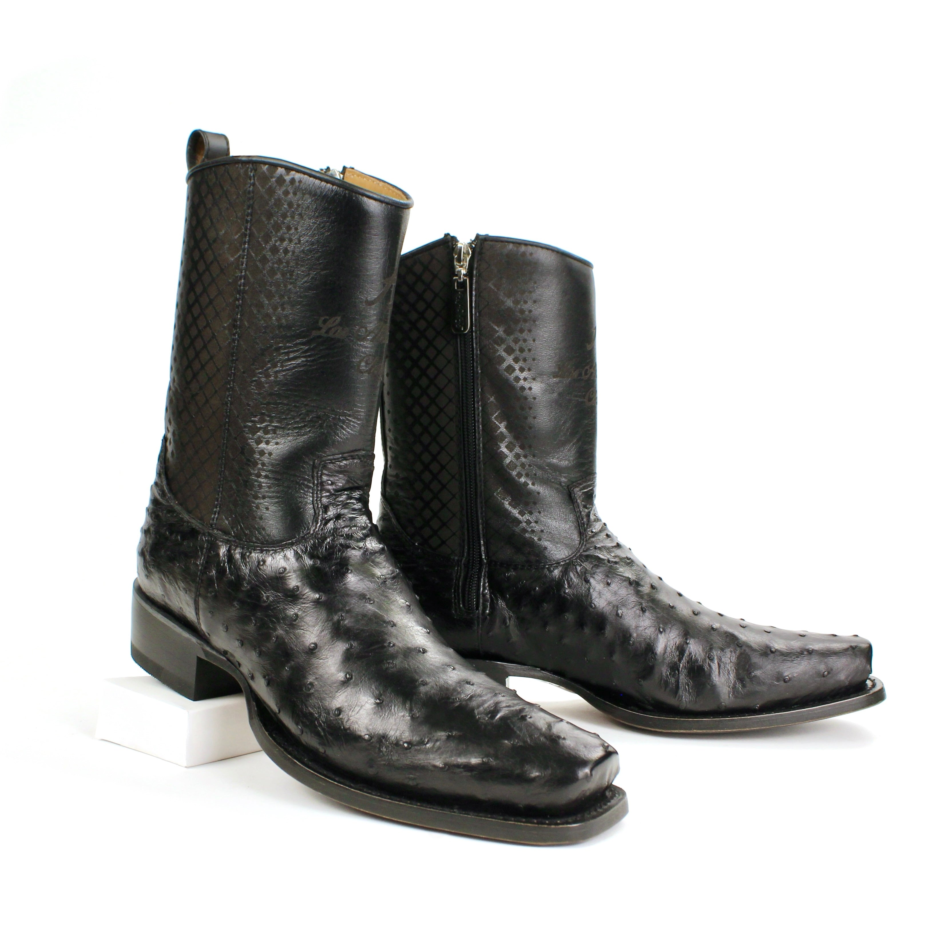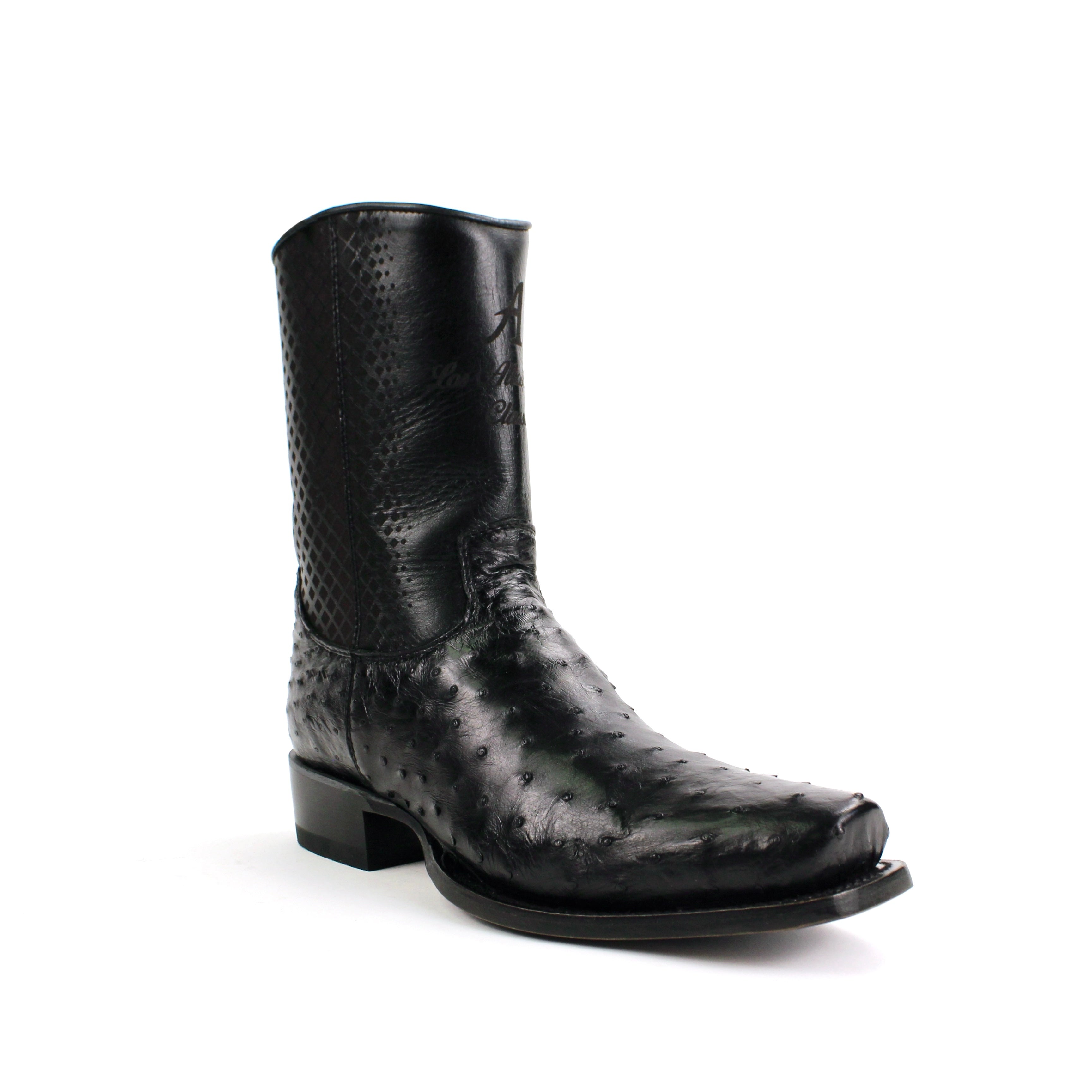 Step into timeless western style with these Black Genuine Ostrich Leg & Leather Cowboy Boots. Handcrafted for durability and sophistication, these boots feature a sleek semi square toe, premium leather shaft with detailed pattern embossing, and an exotic ostrich leg vamp that delivers luxury and comfort in every step. Perfect for both formal and casual occasions, these boots make a bold statement for modern cowboys who appreciate craftsmanship and elegance.