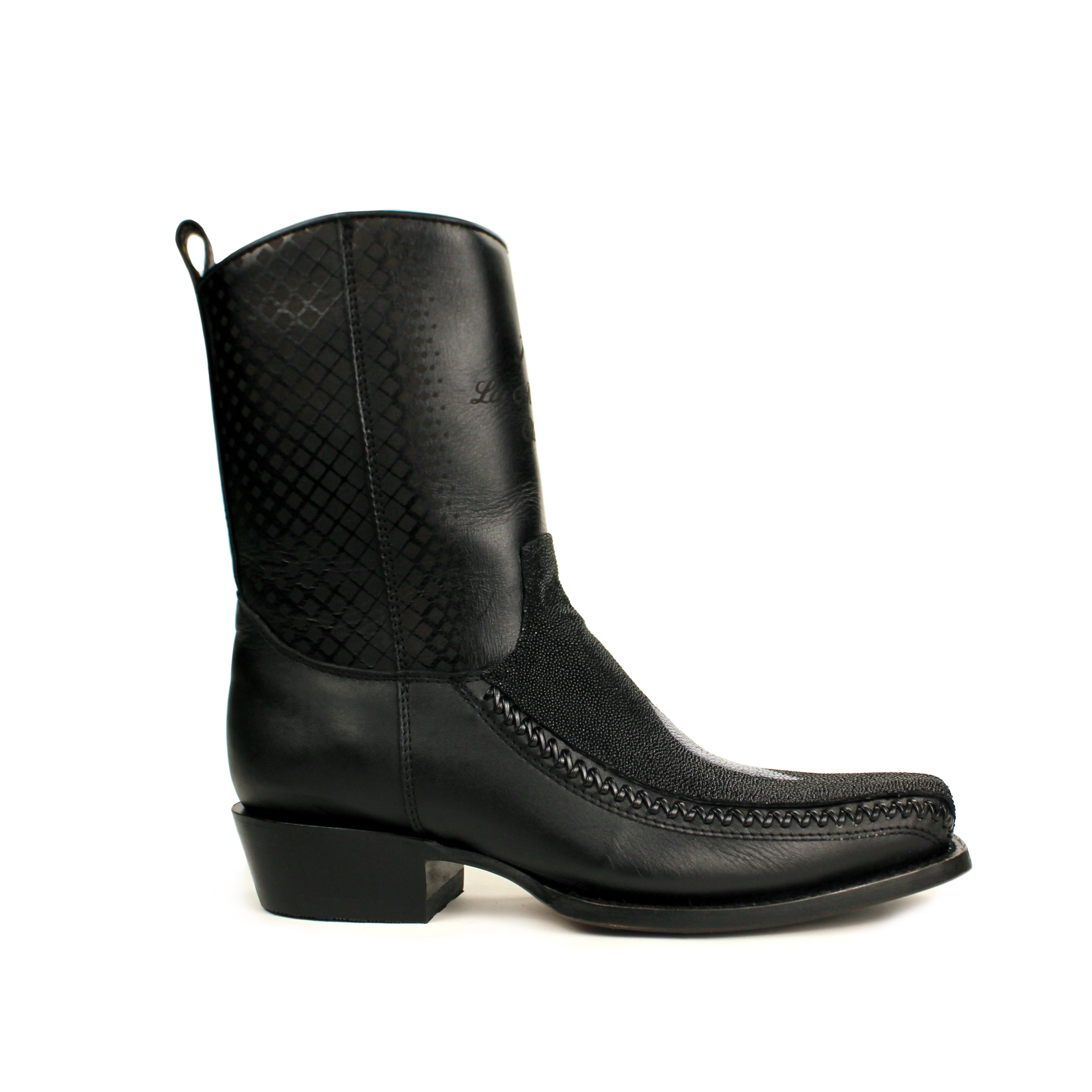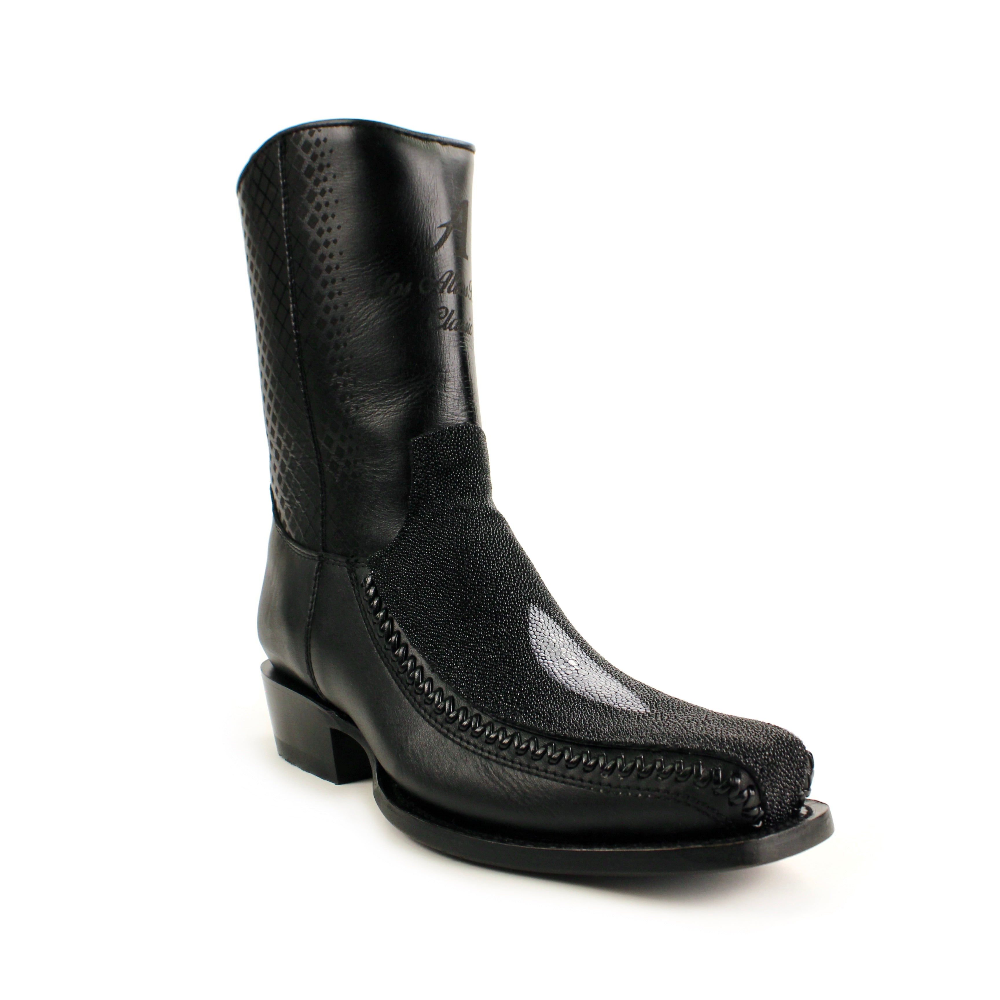 Command attention in the Los Altos Men’s Black Stingray & Leather Cowboy Boot, a symbol of power and refined western craftsmanship. Made in Mexico with genuine stingray leather on the vamp and premium cowhide on the shaft, this exotic boot delivers durability, comfort, and unmatched style. The sleek black finish and square toe design make it a perfect fit for both special occasions and everyday western wear. Built for the modern cowboy who values tradition and luxury.