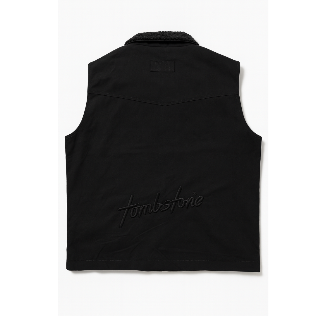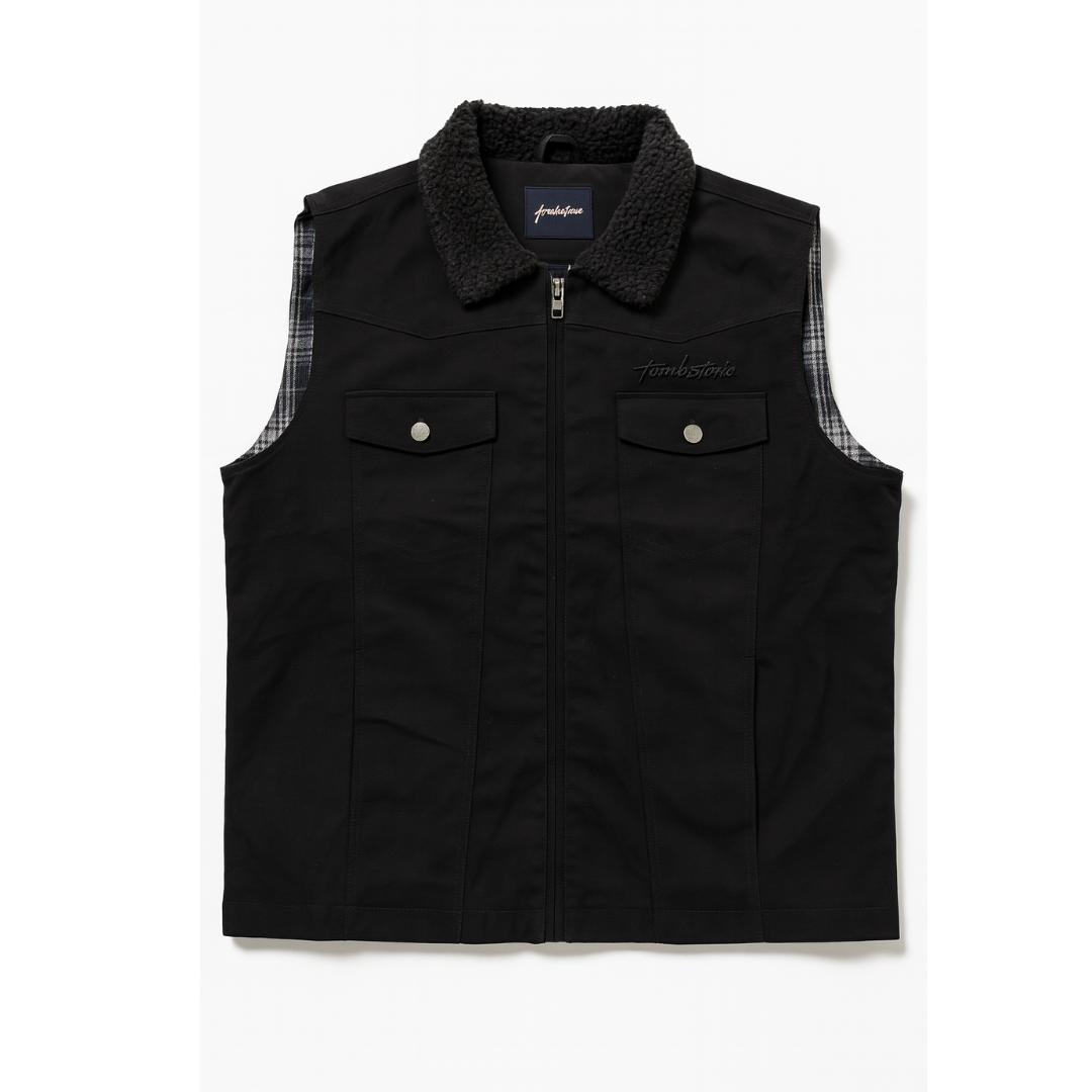 The Tombstone Canvas Vest combines rugged canvas, plaid flannel panels, and a warm sherpa collar for an authentic Western look. Features include embroidered logos, dual chest pockets, and a durable full-zip front.