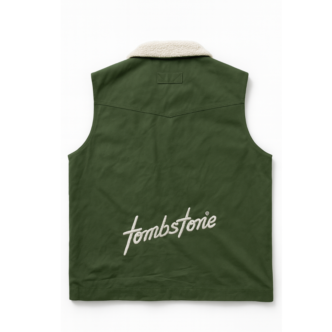 The Tombstone Canvas Vest combines rugged canvas, plaid flannel panels, and a warm sherpa collar for an authentic Western look. Features include embroidered logos, dual chest pockets, and a durable full-zip front.