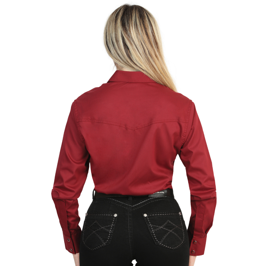 Stand out with bold Western style in this El General Women’s Burgundy Long Sleeve Button Down Shirt. Designed with a flattering cowgirl fit, this vibrant red shirt delivers both comfort and durability for everyday wear, rodeos, ranch life, and Western events. It features classic Western yokes, detailed chest pockets with snap closures, and high-quality stitching throughout. Lightweight and breathable, this shirt pairs perfectly with jeans, boots, and belts for a polished cowgirl look you can wear anywhere.
