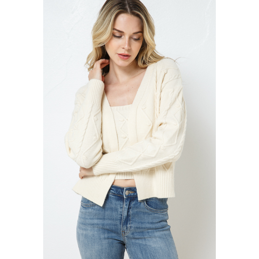 Add a touch of western sophistication to your wardrobe with this two-piece ribbed knit lounge set featuring a camisole tank top and crop cardigan. The set is made of a knit blend with a textured feel. Whether styled for a chic city look or a modern cowgirl outfit, this knit set brings effortless style and warmth to any occasion.