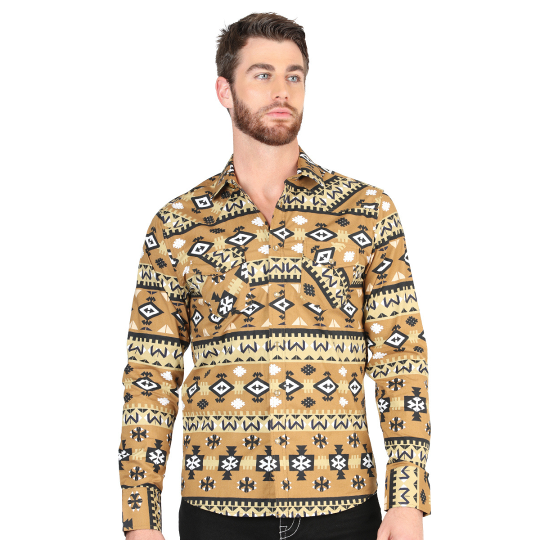 Bring classic Western charm to your wardrobe with this El General Men’s Western Button-Down Shirt featuring a rich Mustard base and eye-catching Aztec and horse silhouettes throughout. Made from soft, breathable fabric, it delivers all-day comfort whether you’re at the ranch, rodeo, work, or out with friends. The traditional button-down front and long sleeves create a timeless look that’s stylish, versatile, and authentically Western.