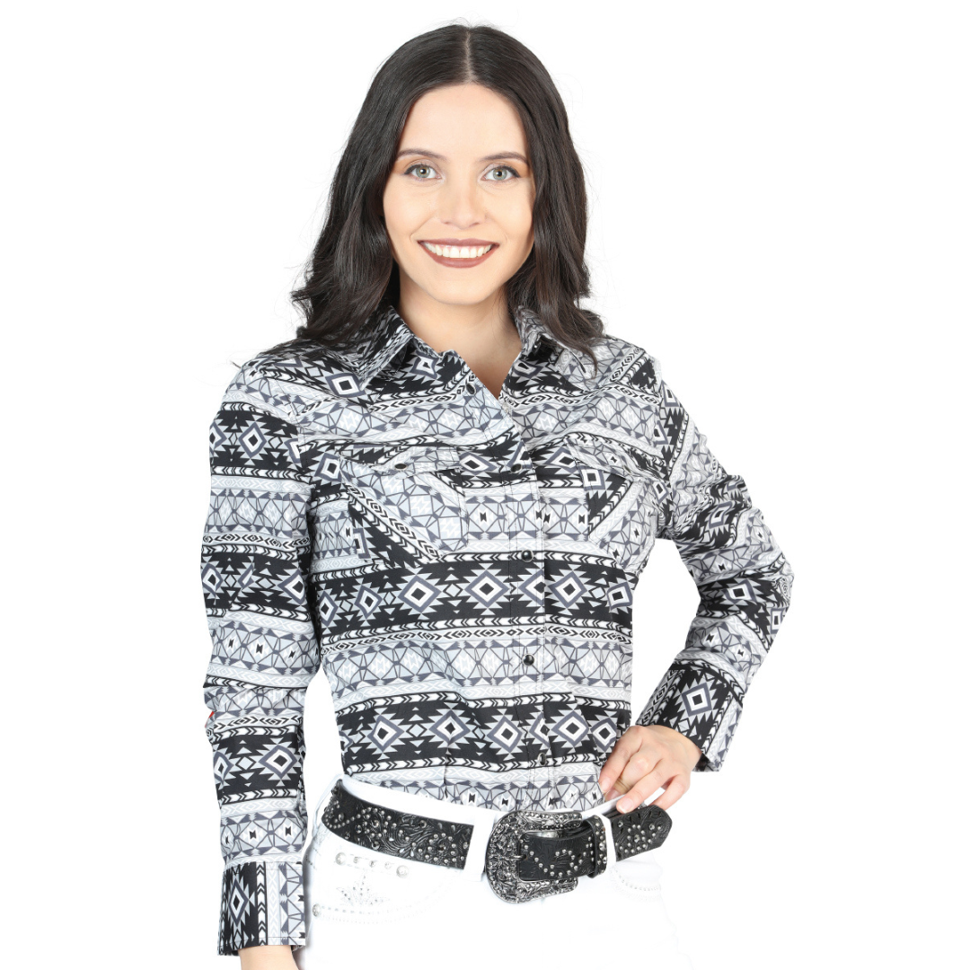 Turn heads with this bold and stylish El General Women’s Western Button-Down Shirt featuring a rich Black and White base and eye-catching Aztec and horse silhouettes throughout. Designed for cowgirls who love standout Western fashion, this long-sleeve shirt delivers both comfort and personality. The tailored fit, snap-button front, and vibrant Southwestern pattern make it perfect for rodeos, festivals, everyday wear, and matching Western looks with the family. Pair it with denim jeans, belts, and your favorite boots for the perfect MexWest outfit.