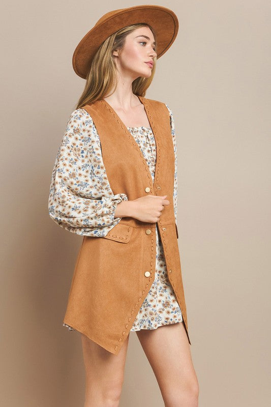 Suede Tan Long Vest- a perfect layering piece for any modern cowgirl. Crafted from soft faux suede, this longline vest features a button-up front, flap faux pockets, and subtle stitched detailing that captures rustic sophistication. Pair it with floral dresses, denim jeans, or boots for a chic, frontier-inspired look that’s effortlessly stylish. Whether you’re headed to a rodeo, festival, or a casual outing, this vest completes your western wardrobe.
